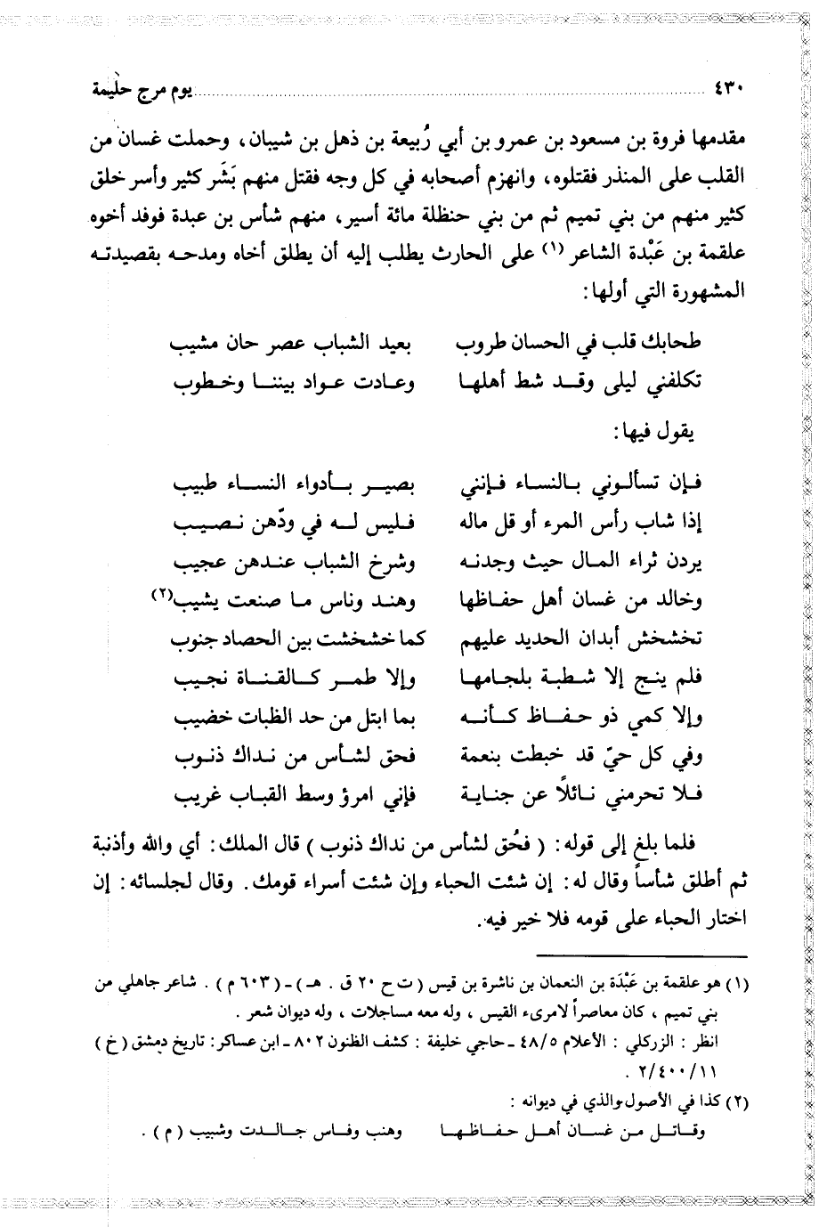 فلما بلغ إلى قوله فحق لشأس من نداك ذنوب قال الملك أي والله وأذنبة ثم أطلق شأسا وقال له إن شئت الحباء وإن شئت أسراء قومك وقال لجلسائه إن اختار الحباء على قومه فلا خير فيه