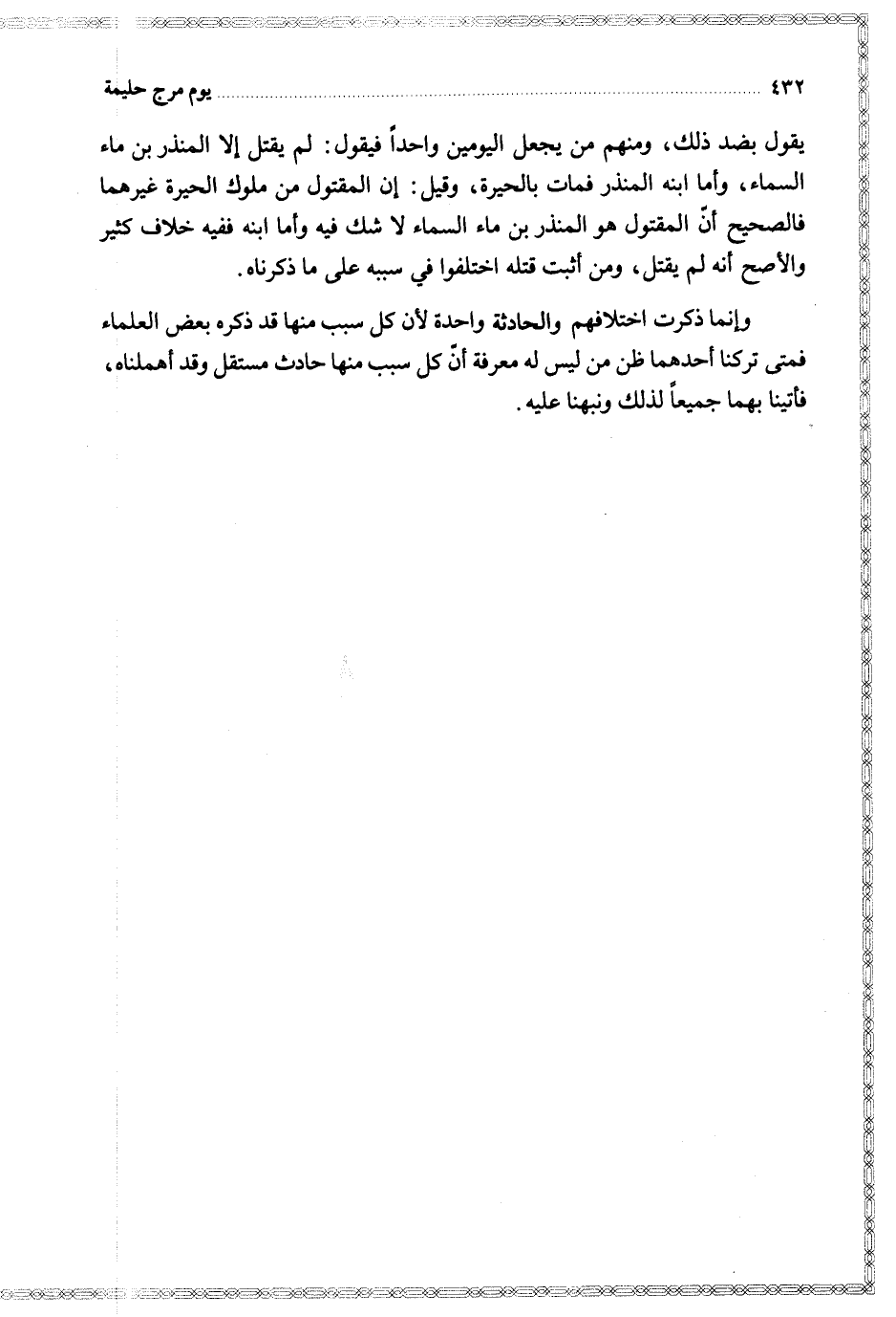 يقول بضد ذلك ومنهم من يجعل اليومين واحدا فيقول لم يقتل إلا المنذر بن ماء السماء وأما ابنه المنذر فمات بالحيرة وقيل إن المقتول من ملوك الحيرة غيرهما فالصحيح أن المقتول هو المنذر بن ماء السماء لا شك فيه وأما ابنه ففيه خلاف كثير والأصح أنه لم يقتل ومن أثبت قتله اختلفوا في سببه على ما ذكرناه