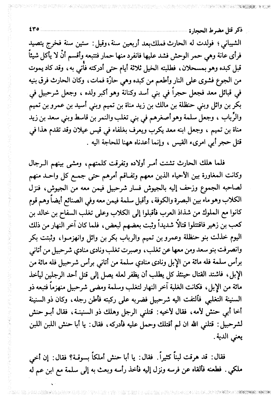 الشيباني فولدت له الحارث فملك بعد أربعين سنة وقيل ستين سنة فخرج يتصيد فرأى عانة وهي حمر الوحش فشد عليها فانفرد منها حمار فتتبعه وأقسم أن لا يأكل شيئا قبل كبده وهو بمسحلان فطلبته الخيل ثلاثة أيام حتى أدركته فأتى به وقد كاد يموت من الجوع فشوى على النار وأطعم من كبده وهي حارة فمات وكان الحارث فرق بنيه في القبائل معد فجعل حجرا في بني أسد وكنانة وهو أكبر ولده وجعل شرحبيل في بكر بن وائل وبني حنظلة بن مالك بن زيد مناة بن تميم وبني أسيد بن عمرو بن تميم والرباب وجعل سلمة وهو أصغرهم في بني تغلب والنمر بن قاسط وبني سعد بن زيد مناة بن تميم وجعل ابنه معد يكرب ويعرف بغلفاء في قيس عيلان وقد تقدم هذا في قتل حجر أبي امرئ القيس وإنما أعدناه ههنا للحاجة إليه