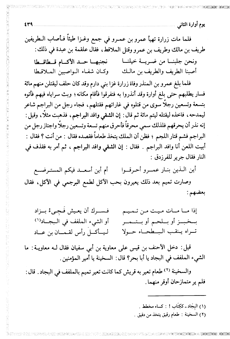 قيل دخل الأحتف بن قيس على معاوية بن أبي سفيان فقال له معاوية ما الشيء الملفف في البجاد يأ أبا بحر قال السخينة يا أمير المؤمنين