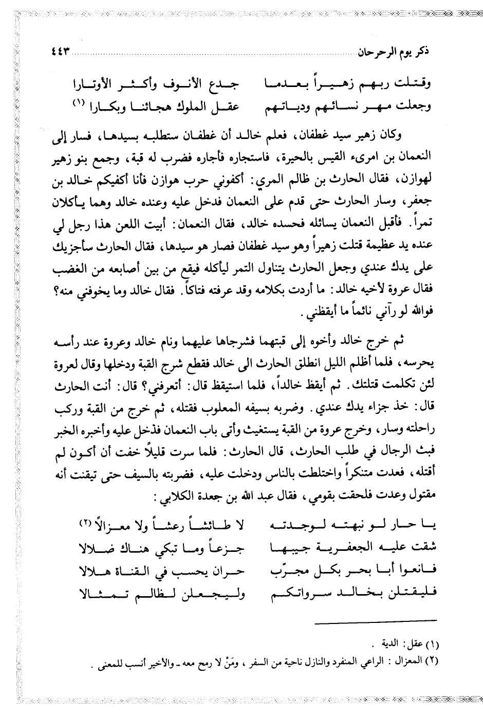 ثم خرج خالد وأخوه إلى قبتهما فشرجاها عليهما ونام خالد وعروة عند رأسه يحرسه فلما أظلم الليل انطلق الحارث إلى خالد فقطع شرج القبة ودخلها وقال لعروة لئن تكلمت قتلتك ثم أيقظ خالدا فلما استيقظ قال أتعرفني قال أنت الحارث قال خذ جزاء يدك عندي وضربه بسيف المعلوب فقتله ثم خرج من القبة وركب راحلته وسار وخرج عروة من القبة يستغيث وأتى باب النعمان فدخل عليه وأخبره الخبر فبث الرجال في طلب الحارث قال الحارث فلما سرت قليلا خفت أن أكون لم أقتله فعدت متنكرا واختلطت بالناس ودخلت عليه فضربته بالسيف حتى تيقنت أنه مقتول وعدت فلحقت بقومي فقال عبد الله بن جعدة الكلابي