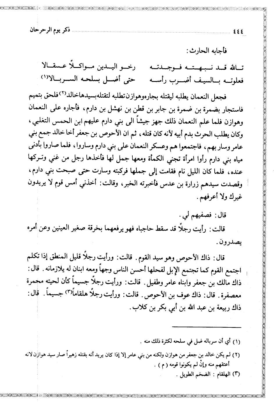 قال ذاك الأحوص وهو سيد القوم قالت ورأيت رجلا قليل المنطق إذا تكلم اجتمع القوم كما تجتمع الإبل لفحلها أحسن الناس وجها ومعه ابنان له يلازمانه قال ذاك مالك بن جعفر وابناه عامر وطفيل قالت ورأيت رجلا جسيما كأن لحيته محمرة معصفرة قال ذاك عوف بن الأحوص قالت ورأيت رجلا هلقاما جسيما قال ذاك ربيعة بن عبد الله بن أبي بكر بن كلاب