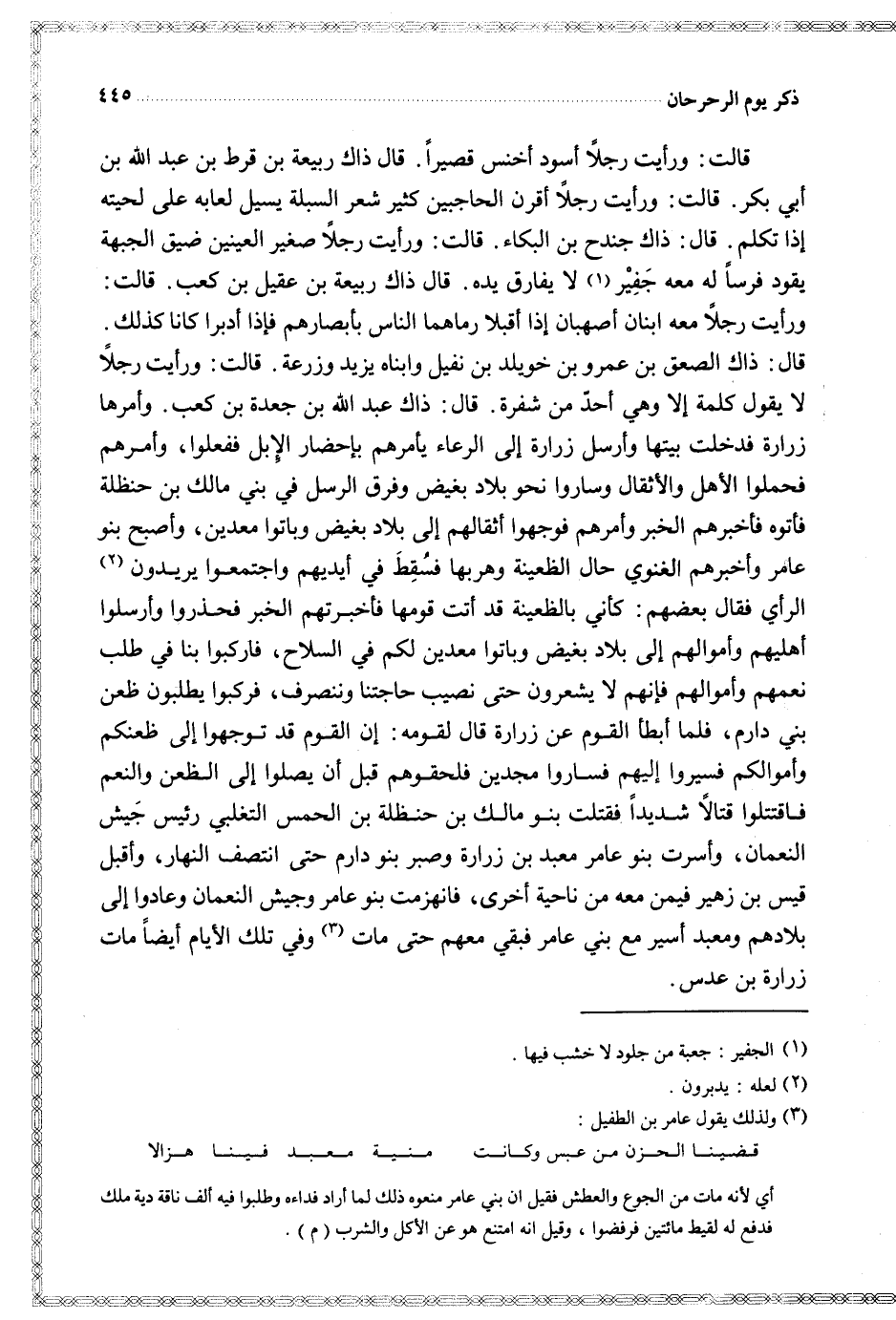 قالت ورأيت رجلا أسود أخنس قصيرا قال ذاك ربيعة بن قرط بن عبد الله بن أبي بكر قالت ورأيت رجلا أقرن الحاجبين كثير شعر السبلة يسيل لعابه على لحيته إذا تكلم قال ذاك جندح بن البكاء قالت ورأيت رجلا صغير العينين ضيق الجبهة يقود فرسا له معه جفير لا يفارق يده قال ذاك ربيعة بن عقيل بن كعب قالت ورأيت رجلا معه ابنان أصبهان إذا أقبلا رماهما الناس بأبصارهم فإذا أدبرا كانا كذلك قال ذاك الصعق بن عمرو بن خويلد بن نفيل وابناه يزيد وزرعة قالت ورأيت رجلا لا يقول كلمة إلا وهي أحد من شفرة قال ذاك عبد الله بن جعدة بن كعب وأمرها زرارة فدخلت بيتها وأرسل زرارة إلى الرعاء يأمرهم بإحضار الإبل ففعلوا وأمرهم فحملوا الأهل والأثقال وساروا نحو بلاد بغيض وفرق الرسل في بني مالك ين حنظلة فأتوه فأخبرهم الغنوي حال الظعينة وهربها فسقط في أيديهم واجتمعوا يريدون الرأي فقال بعضهم كأني بالظعينة قد أتت قومها فأخبرتهم الخبر فحذروا وأرسلوا أهليهم وأموالهم إلى بلاد بغيض وباتوا معدين لكم في السلاح فاركبوا بنا في طلب نعمهم وأموالهم فإنهم لا يشعرون حتى نصيب حاجتنا وننصرف فركبوا يطلبون ظعن بني دارم فلما أبطأ القوم عن زرارة قال لقومه إن القوم قد توجهوا إلى ظعنكم وأموالكم فسيروا إليهم فساروا مجدين فلحقوهم قبل أن يصلوا إلى الظعن والنعم فاقتتلوا قتالا شديدا فقتلت بنو مالك بن حنظلة بن الحمس التغلبي رئيس جيش النعمان وأسرت بنو عامر معبد بن زرارة وصبر بنو دارم حتى انتصف النهار وأقبل قيس بن زهير فيمن معه من ناحية أخرى فانهزمت بنو عامر وجيش النعمان وعادوا إلى بلادهم ومعبد أسير مع بني عامر فبقي معهم حتى مات وفي تلك الأيام أيضا مات زرارة بن عدس
