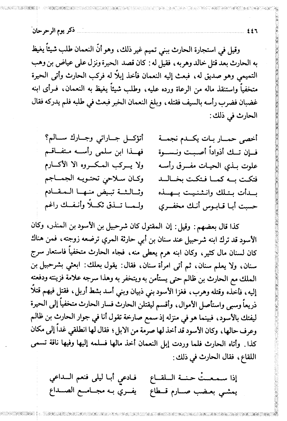 وقيل في استجارة الحارث ببني تميم غير ذلك وهو أن النعمان طلب شيئا يغيظ به الحارث بعد قتل خالد وهربه فقيل له كان قصد الحيرة ونزل على عياض بن وهب التميمي وهو صديق له فبعث إليه النعمان فأخذ إبلا له فركب الحارث وأتى الحيرة متخفيا واسنتفذ ماله من الرعاة ورده عليه وطلب شيئا يغيظ به النعمان فرأى ابنه غضبان فضرب رأسه بالسيف فقتله وبلغ النعمان الخبر فبعث في طلبه فلم يدركه فقال الحارث في ذلك