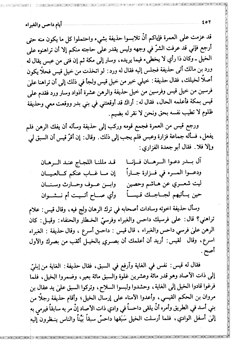 قد عزمت على العمرة فإياكم أن تلابسوا حذيفة بشيء واحتملوا كل ما يكون منه حتى أرجع فإني قد عرفت الشر في وجهه وليس يقدر على حاجته منكم إلا أن تراهنوه على الخيل وكان ذا رأي لا يخطأ فيما يريده وسار إلى مكة ثم إن فتى من عبس يقال له ورد بن مالك أتى حذيفة فجلس إليه فقال له ورد لو اتخذت من خيل قيس فحلا يكون أصلا لخيلك فقال حذيفة خيلي خير من خيل قيس ولجأ في ذلك إلى أن تراهنا على فرسين من خيل قيس وفرسين من خيل حذيفة والرهن عشرة أذواد وسار ورد فقدم قيس بمكة فأعلمه الحال فقال له أراك قد أوقعتني في بني بدر ووقعت معي وحذيفة ظلوم لا تطيب نفسه بحق ونحن لا نقر له بضيم