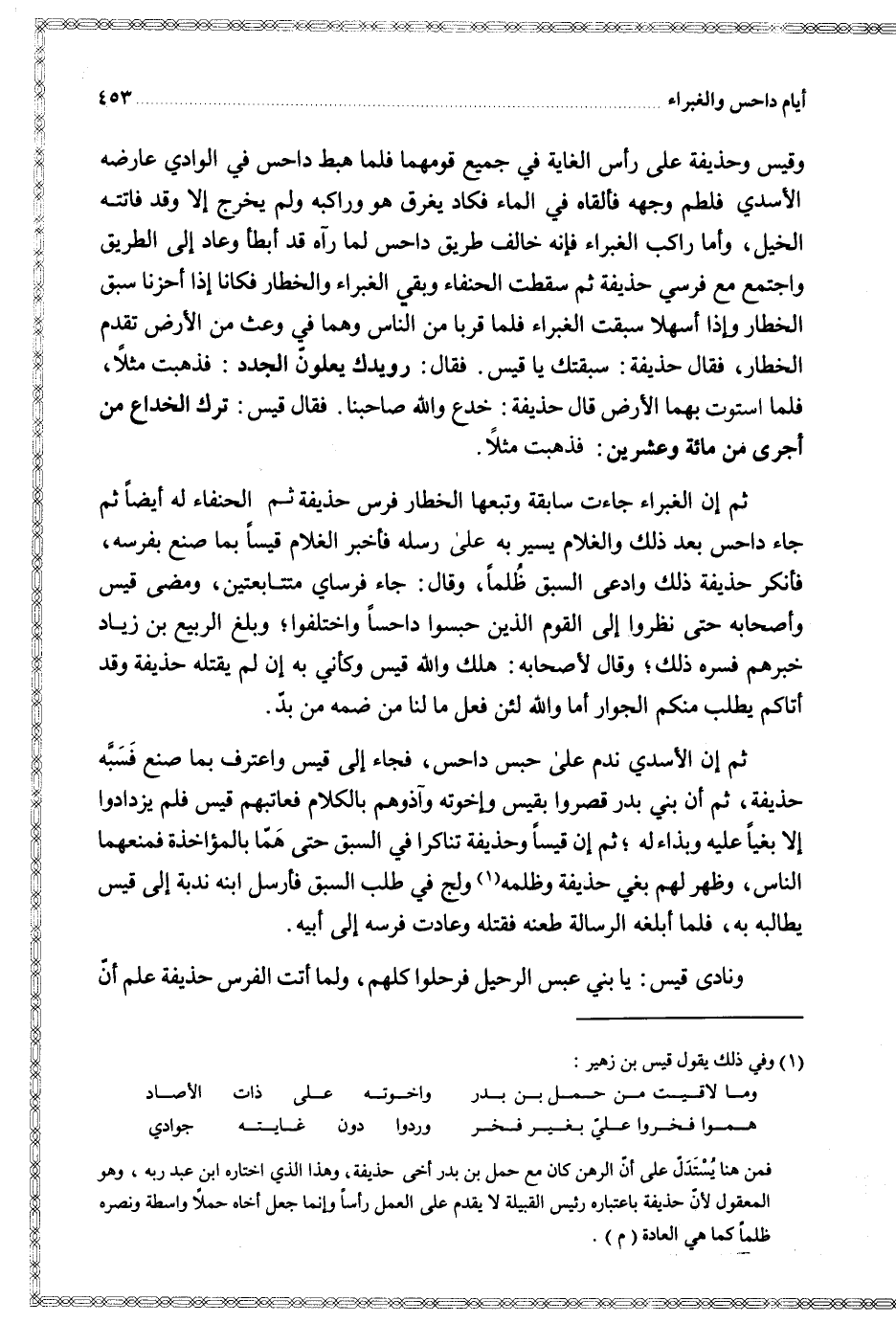ثم إن الأسدي ندم على حبس داحس فجاء إلى قيس واعترف بما صنع فسبه حذيفة ثم أن بني بدر قصروا بقيس وإخوته وآذوهم بالكلام فعاتبهم قيس فلم يزدادوا إلا بغيا عليه وبذاء له ثم إن قيسا وحذيفة تناكرا في السبق حتى هما بالمؤاخذة فمنعهما الناس وظهر لهم بغي حذيفة وظلمه ولج في طلب السبق فأرسل ابنه ندبة إلى قيس يطالبه به فلما أبلغه الرسالة طعنه فقتله وعادت فرسه إلى أبيه