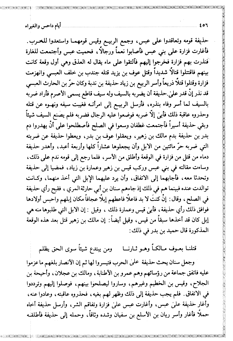 حذيفة قومه وتعاقدوا على عبس وجمع الربيع وقيس قومهما واستعدوا للحرب فأغارت فزارة على بني عبس فأصابوا نعما ورجالا فحميت عبس واجتمعت للغارة فنذرت بهم فزارة فخرجوا إليهم فالتقوا على ماء يقال له العذق وهي أول وقعة كانت بينهم فاقتتلوا قتالا شديدا وقتل عوف بن يزيد قتله جندب بن خلف العبسي وانهزمت فزارة وقتلوا قتلا ذريعا وأسر الربيع بن زياد حذيفة بن ندبة وكان حر بن الحارث العبسي قد نذر إن قدر على حذيفة أن يضربه بالسيف وله سيف قاطع يسمى الأصرم فأراد ضربه بالسيف لما أسر وافاء بنذره فأرسل الربيع إلى امرأته فغيبت سيفه ونهوه عن قتله وحذروه عاقبة ذلك فأبى إلا ضربه فوضعوا عليه الرجال فضربه فلم يصنع السيف شيئا وبقي حذيفة أسيرا فاجتمعت غطفان وسعوا في الصلح فاصطلحوا على أن يهدروا دم بدر بن حذيفة بدم مالك بن زهير ويعقلوا عوف بن بدر ويعطوا حذيفة عن ضربته التي ضربه حر مائتين من الابل وأن يجعلوها عشارا كلها وأربعة أعبد وأهدر حذيفة دماء من قتل من فزارة في الوقعة وأطلق من الأسر فلما رجع إلى قومه ندم على ذلك وساءت مقالته في بني عبس وركب قيس بن زهير وعمارة بن زياد فمضيا إلى حذيفة وتحدثا معه فأجابهما إلى الاتفاق وأن يرد عليهما الإبل التي أخذ منهما وكانت توالدت عنده فبينما هم في ذلك إذ جاءهم سنان بن أبي حارثة المري فقبح رأي حذيفة في الصلح وقال إن كنت لا بد فاعلا فاعطهم إبلا عجافا مكان إبلهم واحبس أولادها فوافق ذلك رأي حذيفة فأبى قيس وعمارة ذلك وقيل إن الإبل التي طلبوها منه هي إبل كان قد أخذها سبقا من قيس وقيل أيضا إن مالك بن زهير قتل بعد هذه الوقعة المذكورة قال حميد بن بدر في ذلك