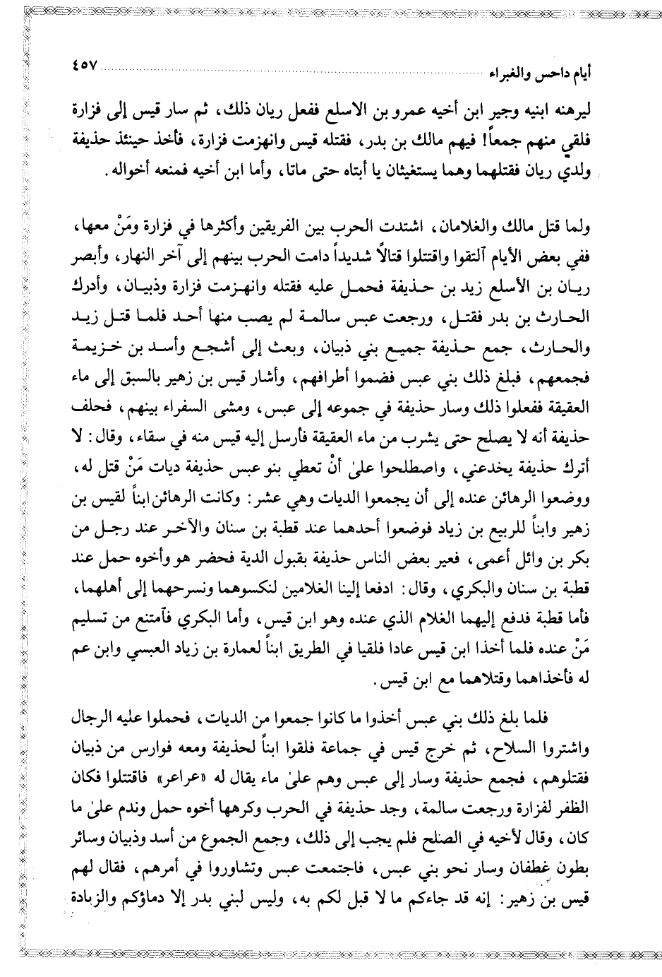 ولما قتل مالك والغلامان اشتدت الحرب بين الفريقين وأكثرهما في فزارة ومن معها ففي بعض الأيام التقوا واقتتلوا قتالا شديدا دامت الحرب بينهم إلى آخر النهار وأبصر ريان بن الأسلع زيد بن حذيفة فحمل عليه فقتله وانهزمت فزارة وذبيان وأدرك الحارث بن بدر فقتل ورجعت عبس سالمة لم يصب منها أحد فلما قتل زيد والحارث جمع حذيفة جميع بني ذبيان وبعث إلى أشجع وأسد بن خزيمة فجمعهم فبلغ ذلك بني عبس فضموا أطرافهم وأشار قيس بن زهير بالسبق إلى ماء العقيقة ففعلوا ذلك وسار حذيفة في جموع إلى عبس ومشى السفراء بينهم فحلف حذيفة أنه لا يصلح حتى يشرب من ماء العقيقة فأرسل إليه قيس منه في سقاء وقال لا أترك حذيفة يخدعني واصطلحوا على أن تعطي بنو عبس حذيفة ديات من قتل له ووضعوا الرهائن عنده إلى أن يجمعوا الديات وهي عشر وكانت الرهائن ابنا لقيس بن زهير وابنا للربيع بن زياد فوضعوا أحدهما عند قبطة بن سنان والآخر عند رجل من بكر بن وائل أعمى فعير بعض الناس حذيفة بقبول الدية فحضر هو وأخوه حمل عند قطبة بن سنان والبكري وقال ادفعا إلينا الغلامين لنكسوهما ونسرحهما إلى أهلهما فأما قطبة فدفع إليهما الغلام الذي عنده وهو ابن قيس وأما البكري فامتنع من تسليم من عنده فلما أخذا ابن قيس عادا فلقيا في الطريق ابنا لعمارة بن زياد العبسي وابن عم له فأخذاهما وقتلاهما مع ابن قيس