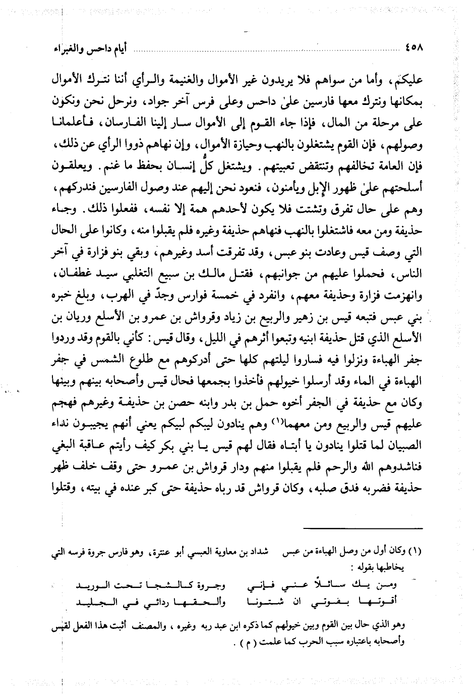 عليكم وأما من سواهم فلا يريدون غير الأموال والغنيمة والرأي أننا نترك الأموال بمكانها ونترك معها فارسين على داحس وعلى فرس آخر جواد ونرحل نحن ونكون على مرحلة من المال فإذا جاء القوم إلى الأموال سار إلينا الفارسان فأعلمانا وصولهم فإن القوم يشتغلون بالنهب وحيازة الأموال وإن نهاهم ذووا الرأي عن ذلك فإن العامة تخالفهم وتنتقض تعبيتهم ويشتغل كل إنسان بحفظ ما غنم ويعلقون أسلحتهم على ظهورالإبل ويأمنون فنعود نحن إليهم عند وصول الفارسين فندركهم وهم على حال تفرق وتشتت فلا يكون لأحدهم همة إلا نفسه ففعلوا ذلك وجاء حذيفة ومن معه فاشتغلوا بالنهب فنهاهم حذيفة وغيره فلم يقبلوا منه وكانوا على الحال التي وصف قيس وعادت بنو عبس وقد تفرقت أسد وغيرهم وبقي بنو فزارة في آخر الناس فحملوا عليهم من جوانبهم فقتل مالك بن سبيع التغلبي سيد غطفان وانهزمت فزارة وحذيفة معهم وانفرد في خمسة فوارس وجد في الهرب وبلغ خبره بني عبس فتبعه قيس بن زهير والربيع بن زياد وقرواش بن عمرو بن الأسلع وريان بن الأسلع الذي قتل حذيفة ابنيه وتبعوا أثرهم في الليل وقال قسي كأني بالقوم وقد وردوا جفر الهباءة ونزلوا فيه فساروا ليلتهم كلها حتى أدركوهم مع طلوع الشمس في جفر الهباءة في الماء وقد أرسلوا خيولهم فأخذوا بجمعها فحال قيس وأصحابه بينهم وبينها وكان مع حذيفة في الجفر أخوه حمل بن بدر وابنه حصن بن حذيفة وغيرهم فهجم عليهم قيس والربيع ومن معهما وهم ينادون ليبكم لبيكم يعني أنهم يجيبون نداء الصبيان لما قتلوا ينادون يا أبتاه فقال لهم قيس يا بني بكر كيف رأيتم عاقبة البغي فناشدوهم الله والرحم فلم يقبلوا منهم ودار قرواش بن عمرو حتى وقف خلف ظهر حذيفة فضربه فدق صلبه وكان قرواش قد رباه حذيفة حتى كبر عنده في بيته وقتلوا