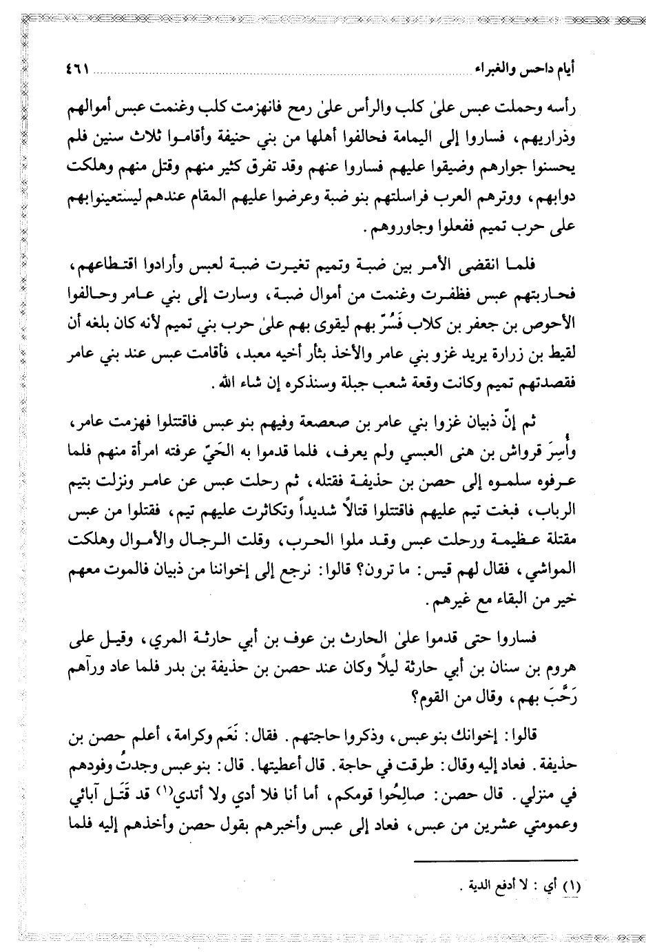 قالوا إخوانك بنو عبس وذكروا حاجتهم فقال نعم وكرامة أعلم حصن بن حذيفة فعاد إليه وقال طرقت في حاجة قال أعطيتها قال بنو عبس وجدت وفودهم في منزلي قال حصن صالحوا قومكم أما أنا فلا أدي ولا أتدي قد قتل آبائي وعمومتي عشرين من عبس فعاد إلى عبس وأخبرهم بقول حصن وأخذهم إليه فلما
