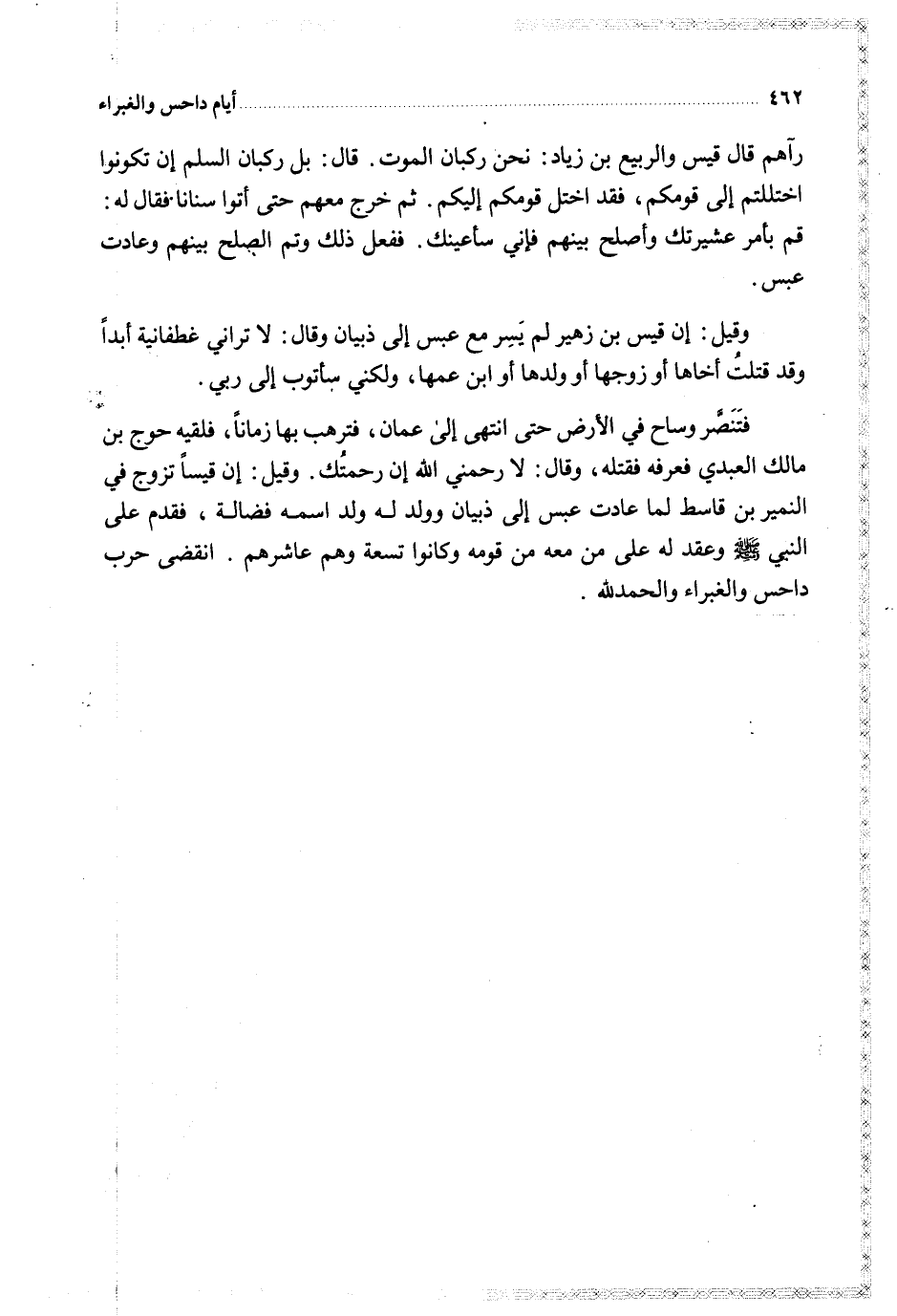 فتنصر وساح في الأرض حتى انتهى إلى عمان فترهب بها زمانا فلقيه حوج بن مالك العبدي فعرفه فقتله وقال لا رحمني الله إن رحمتك وقيل إن قيسا تزوج في النمير بن قاسط لما عادت عبس إلى ذبيان وولد له ولد اسمه فضالة فقدم على النبي وعقد له على من معه من قومه وكانوا تسعة وهم عاشرهم انقضى حرب داحس والغبراء والحمد لله