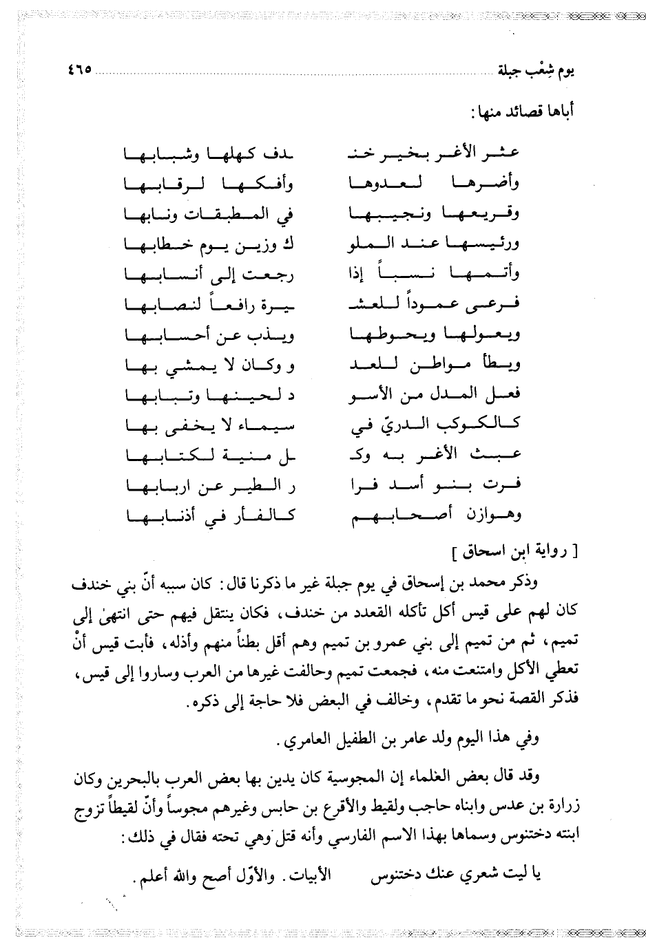 وذكر محمد بن إسحاق في يوم جبلة غير ما ذكرنا قال كان سببه أن بني خندف كان لهم على قيس أكل تأكله القعدد من خندف فكان ينتقل فيهم حتى انتهى إلى تميم ثم من تميم إلى بني عمرو بن تميم وهم أقل بطنا منهم وأذله فأبت قيس أن تعطي الأكل وامتنعت منه فجمعت تميم وحالفت غيرها من العرب وساروا إلى قيس فذكر القصة نحو ما تقدم وخالف في البعض فلا حاجة إلى ذكره