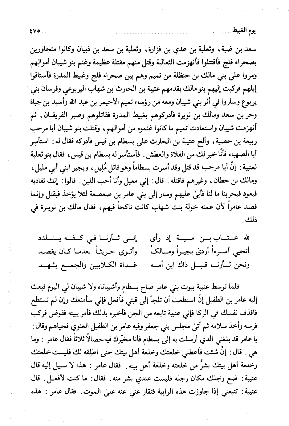 سعد بن ضبة وثعلبة بن عدي وثعلبة بن سعد بن ذبيان وكانوا متجاورين بصحراء فلج فاقتتلوا فانهزمت الثعالبة وقتل منهم مقتلة عظيمة وغنم بنو شيبان أموالهم ومروا على بني حنظلة من تميم وهم بين صحراء فلج وغبيط المدرة فاستاقوا إبلهم فركبت إليهم بنو مالك يقدمهم عتيبة بن الحارث بن شهاب اليربوعي وفرسان بني يربوع وساروا في أثر بني شيبان ومعه من رؤساء تميم الأحيمر بن عبد الله وأسيد بن جباة وحر بن سعد ومالك بن نويرة فأدركوهم بغبيط المدرة فقاتلوهم وصبر الفريقان ثم انهزمت شيبان واستعادت تميم ما كانوا غنموه من أموالهم وقتلت بنو شيبان أبا مرحب ربيعة بن حصية وألح عتيبة بن الحارث على بسطام بن قيس فأدركه فقال له استأسر أبا الصهباء فأنا خير لك من الفلاة والعطش فاستأسر له بسطام بن قيس فقال بنو ثعلبة لعتيبة إن أبا مرحب قد قتل وقد أسرت بسطاما وهو قاتل مليل وبجير ابني أبي مليل ومالك بن حطان وغيرهم فاقتله قال إني معيل وأنا أحب اللبن قالوا إنك تفاديه فيعود فيحربنا ما لنا فأبى عليهم وسار إلى بني عامر بن صعصعة لئلا يؤخذ فيقتل وإنما قصد عامرا لأن عمته خولة بنت شهاب كانت ناكحا فيهم فقال ملك بن نويرة في ذلك
