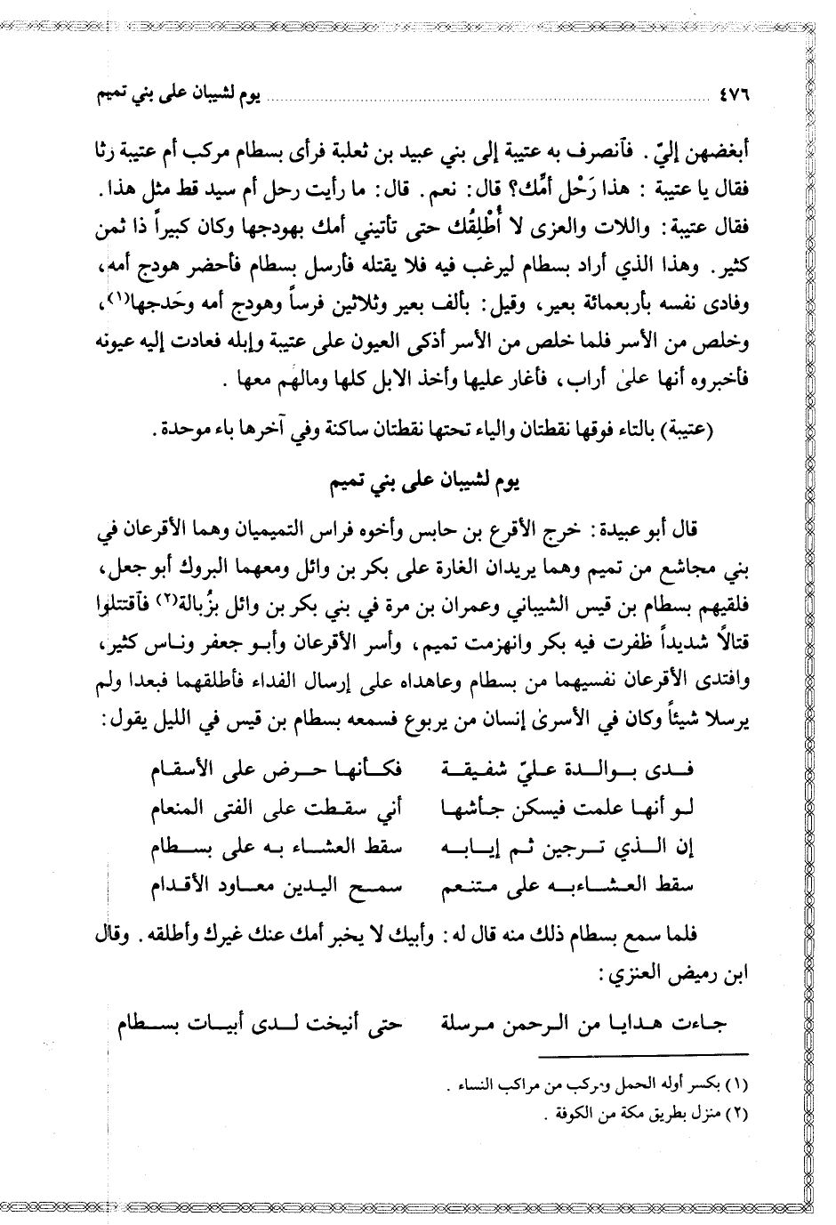 أبغضهن إلي فانصرف به عتيبة إلى بني عبيد بن ثعلبة فرأى بسطام مركب أم عتيبة رثا فقال يا عتيبة هذا رحل أمك قال نعم قال ما رأيت رحل أم سيد قط مثل هذا فقال عتيبة واللات والعزى لا أطلقك حتى تأتيني أمك بهودجا وكان كبيرا ذا ثمن كثير وهذا الذي أراد بسطام ليرغب فيه فلا يقتله فأرسل بسطام فأحضر هودج أمه وفادى نفسه بأربعمائة بعير وقيل بألف بعير وثلاثين فرسا وهودج أمه وحدجها وخلص من الأسر فلما خلص من الأسر أذكى العيون على عتيبة وإبله فعادت إليه عيونه فأخبروه أنها على أراب فأغار عليها وأخذ الإبل كلها ومالهم معها