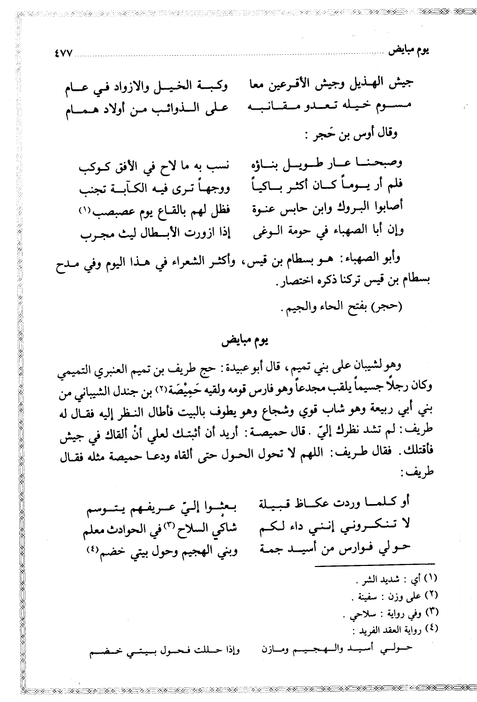 وهو لشيبان على بني تميم قال أبو عبيدة حج طريف بن تميم العنبري التميمي وكان رجلا جسيما يلقب مجدعا وهو فارس قومه ولقيه حميصة بن جندل الشيباني من بني أبي ربيعة وهو شاب قوي وشجاعلا وهو يطوف بالبيت فأطال النظر إليه فقال له طريف لم تشد نظرك إلي قال حميصة أريد أن أثبتك لعلي أن ألقاك في جيش فاقتلك فقال طريف اللهم لا تحول الحول حتى ألقاه ودعا حميصة مثله فقال طريف