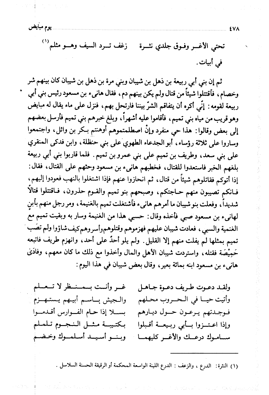 ثم إن بني أبي ربيعة بن ذهل بن شيبان وبني مرة بن ذهل بن شيبان كان بينهم شر وخصام فاقتتلوا شيئا من قتال ولم يكن بينهم دم فقال هانئ بن مسعود رئيس بني أبي ربيعة لقومه إني أكره أن يتفاقم الشر بيننا فارتحل بهم فنزل على ماء يقال له مبايض وهو قريب من مياه بني تميم فأقاموا عليه أشهرا وبلغ خبرهم بني تميم فأسل بعضهم إلى بعض وقالوا هذا حي منفرد وإن اصطلمتموهم أوهنتم بكر بن وائل واجتمعوا وساروا على ثلاثة رؤساء أبو الجدعاء الطهوي على بني حنظلة وابن فدكى المنقري على بني سعد وطريف بن تميم على بني عمرو بن تميم فلما قاربوا بني أبي ربيعة بلغهم الخبر فاستعدوا للقتال فخطبهم هانئ بن مسعود وحثهم على القتال فقال إذا أتوكم فقاتلوهم شيئا من قتال ثم انحازوا عنهم فإذا اشتغلوا بالنهب فعودوا إليهم فانكم تصيبون منهم حاجتكم وصبحهم بنو تميم والقوم حذرون فاقتتلوا قتالا شديدا وفعلت بنو شيبان ما أمرهم هانئ فاشتغلت تميم بالغنيمة وسار به وبقيت تميم مع الغنيمة والسبي فعادت شيبان عليهم فهزموهم وقتلوهم وأسروهم كيف شاؤوا ولم تصب تميم بمثلها لم يفلت منهم إلا القليل ولم يلو أحد على أحد وانهزم طريف فاتبعه حميصة فقتله واستردت شيبان الأهل والمال وأخذوا مع ذلك ما كان معهم وفادى هانئ بن مسعود ابنه بمائة بعير وقال بعض شيبان في هذا اليوم