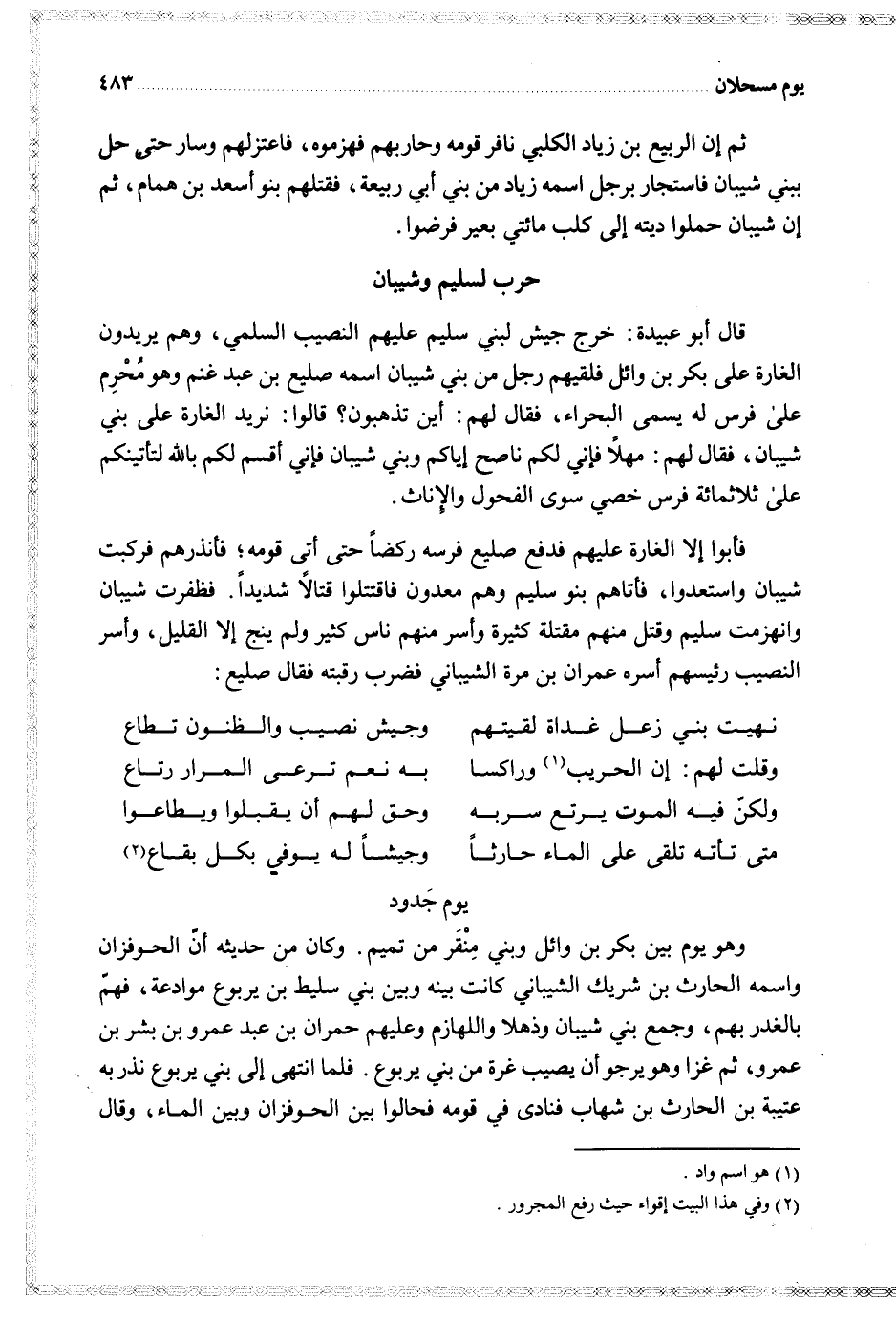 فأبوا إلا الغارة عليهم فدفع صليع فرسه ركضا حتى أتى قومه فأنذرهم فركبت شيبان واستعدوا فأتاهم بنو سليم وهم معدون فاقتتلوا قتالا شديدا فظفرت شيبان وانهزمت سليم وقتل منهم مقتلة كثيرة وأسر منهم ناس كثير ولم ينج إلا القليل وأسر النصيب رئيسهم اسره عمران بن مرة الشيباني فضرب رقبته فقال صليع