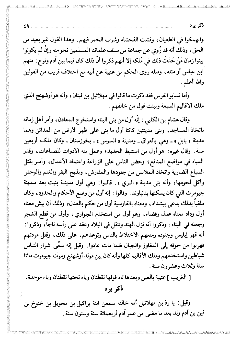 وقيل يا رذ بن مهلائيل أمه خالته سمعنابنة براكيل بن محويل بن خنوخ بن قين بن آدم ولد بعد ما مضى من عمر آدم أربعمائة سنة وستون سنة