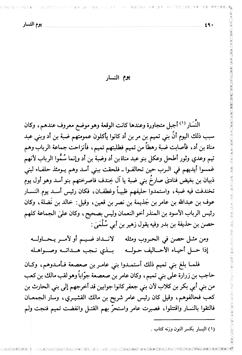 النسار أجبل متجاورة وعندها كانت الوقعة وهو موضع معروف عندهم وكان سبب ذلك اليوم أن بني تميم بن مر بن أد كانوا يأكلون عمومتهم ضبة بن أد وبني عبد مناة بن أد فأصابت ضبة رهطا من تميم فطلبتهم تميم فانزاحت جماعة الرباب وهم تيم وعدي وثور وأطحل وعكل بنو عبعد مناة بن أد وضبة بن أد وإنما سمو الرباب لأنهم غمسوا أيديهم في الرب حتى تحالفوا فلحقت ببني أسد وهم يومئذ حلفاء لبني ذبيان بعن بغيض فنادى صارخ بني ضبة يا آل خندف فاصرختهم بنو أسد وهو أول يوم تخندفت فيه ضبة واستمدوا حليفهم ظبيا وغطفان فكان رئيس أسد يوم النسار عوف بن عبد الله بن عامر بن جذيمة بن نصر بن قعين وقيل خالد بن نضلة وكان رئيس الرباب حذيفة بن بدر وفيه يقول زهير بن أبي سلمى