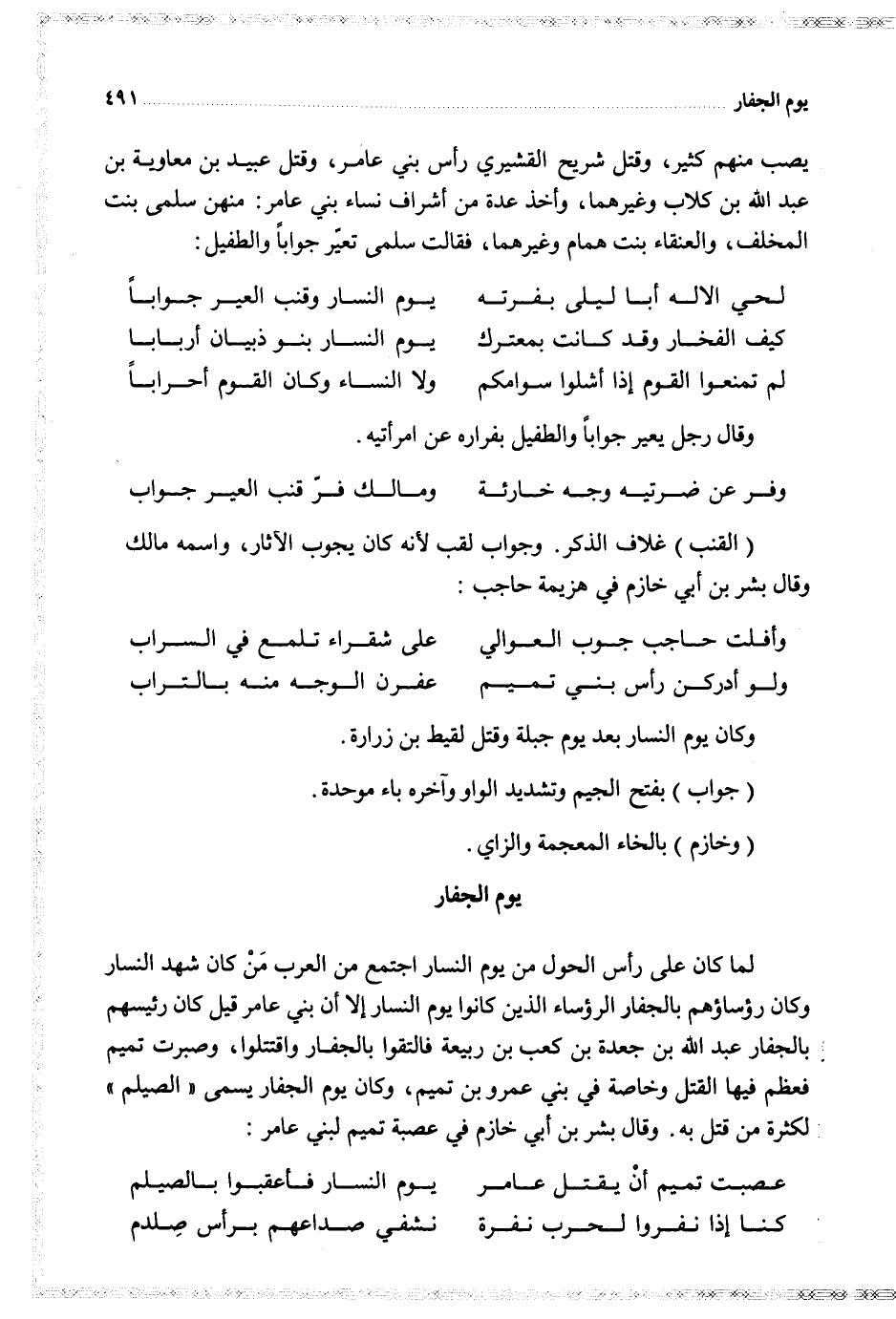 لما كان على رأس الحول من يوم النسار اجتمع من العرب من كان شهد النسار وكان رؤوساؤهم بالجفار الرؤساء الذين كانوا يوم النسار إلا أن بني عامر قيل كان رئيسهم بالجفار عبد الله بن جعدة بن كعب بن ربيعة فالتقوا بالجفار واقتتلوا وصبرت تميم فعظم فيها القتل وخاصة في بني عمرو بن تميم وكان يوم الجفار يسمى (الصليم) لكثرة من قتل به وقال بشر بن أبي خازم في عصبة تميم لبني عامر