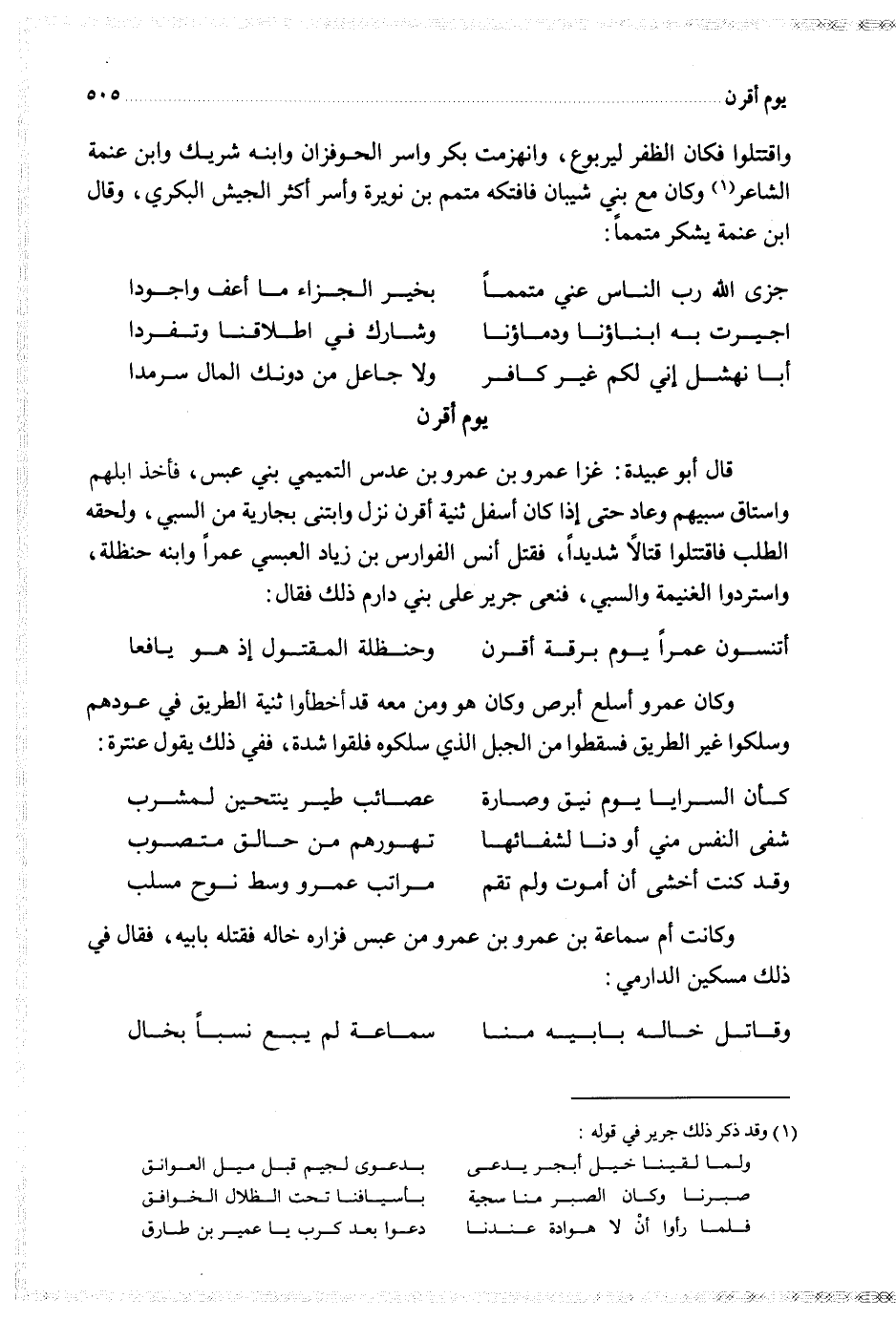 قال أبو عبيدة غزا عمرو بن عمرو بن عدس التميمي بني عبس فأخذ ابلهم واستاق سبيهم وعاد حتى إذا كان أسفل ثنية أقرن نزل وابتنى بجارية من السبي ولحقه الطلب فاقتتلوا قتالا شديدا فقتل أنس الفوارس بن زياد العبسي عمرا وابنه حنظلة واستردوا الغنيمة والسبي فنعى جرير على بني دارم ذلك فقال