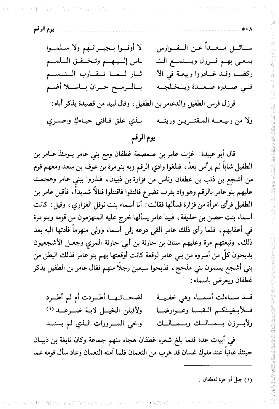 قال أبو عبيدة غزت عامر بن صعصعة غطفان ومع بني عامر يومئذ عامر بن الطفيل شابا لم يرأس بعد فبلغوا وادي الرقم وبه بنو مرة بن عوف بن سعد ومعهم قوم من أشجع بن ذئب بن غطفان وناس من فزارة بن ذبيان فنذورا ببني عامر وهجمت عليهم بنو عامر بالرقم وهو واد بقرب تضرع فالتقوا فاقتتلوا قتالا شديدا فأقبل عامر بن الطفيل فرأى امرأة من فزارة فسألها فقالت أنا أسماء بنت نوفل الفزاري وقيل كانت أسماء بنت حصن بن حذيفة فبينا عامر يسألها خرج عليه المنهزمون من قومه وبنو مرة في أعقابهم فلما رأى ذلك عامر ألقى درعه إلى أسماء وولى منهزما فأدتها إليه بعد ذلك وتبعتهم مرة وعليهم سنان بن حارثة بن أبي حارثة المري وجعل الأشجعيون يذبحون كل من أسروه من بني عامر لوقعة كانت أوقعتها بهم بنو عامر فذلك البطن من بني أشجع يسمون بني مذحج فذبحوا سبعين رجلا منهم فقال عامر بن طفيل يذكر غطفان ويعرض باسماء