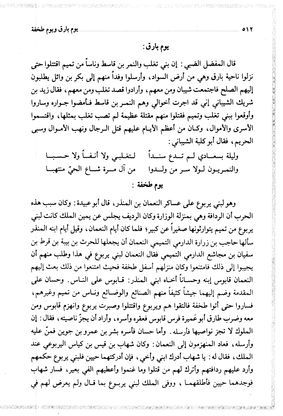 قال المفضل الضبي إن بني تغلب والنمر بن قاسط وناسا من تميم اقتتلوا حتى نزلوا ناحية بارق وهي أرض السواد وأرسلوا وفدا منهم إلى بكر بن وائل يطلبون إليهم الصلح فاجتمعت شيبان ومن معهم وأرادوا قصد تغلب ومن معهم فقال زيد بن شريك الشيباني إني قد اجرت أخوالي وهم النمر بن قاسط فامضوا جواره وساروا وأوقعوا ببني تغلب وتميم فقتلوا منهم مقتله عظيمة لم تصب تغلب بمثلها واقتسموا الأسرى والأموال وكان من أعظم الأيام عليهم قتل الرجال ونهب الأموال وسبى الحريم فقال أبو كلبة الشيباني