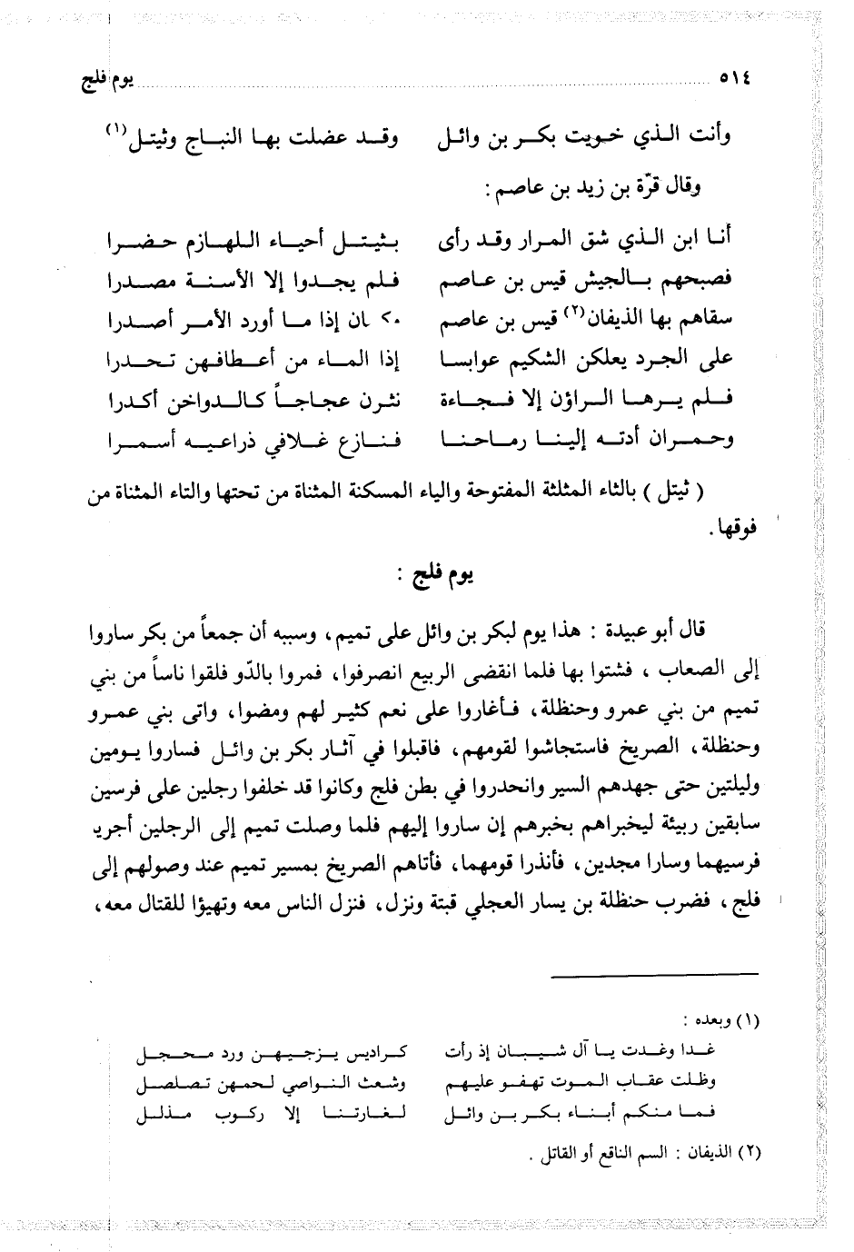 قال أبو عبيدة هذا يوم لبكر بن وائل على تميم وسببه أن جمعا من بكر ساروا إلى الصعاب فشتوا بها فلما انقضى الربيع انصرفوا فمروا بالدو فلقوا ناسا من بني تميم من بني عمرو وحنظلة فأغاروا على نعم كثير لها ومضوا واتى بني عمرو وحنظلة الصريخ فاستجاشوا لقومهم فاقبلوا في آثار بكر بن وائل فساروا يومين وليلتين حتى جهدهم السير وانحدروا في بطن فلج وكانوا قد خلفوا رجلين على فرسين سابقين ربيئة ليخبراهم بخبرهم إن ساروا إليه فلما وصلت تميم إلى الرجلين أجريا فرسيهما وسارا مجدين فأنذرا قومهما فأتاهم الصريخ بمسير تميم عند وصولهم إلى فلج فضرب حنظلة بن يسار العجلي قبتة ونزل فنزل الناس معه وتهيؤا للقتال معه