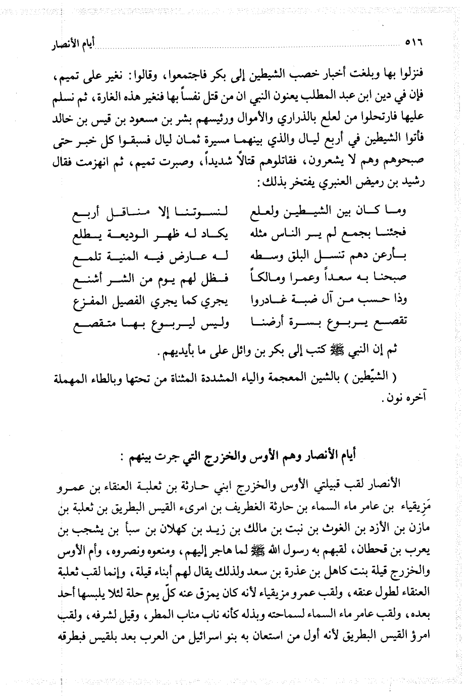 فنزلوا بها وبلغت أخبار خصب الشيطين إلى بكر فاجتمعوا وقالوا نغير على تميم فإن في دين ابن عبد المطلب يعنون النبي ان من قتل نفسا بها فنغير هذه الغارة ثم نسلم عليها فارتحلوا مت لعلع بالذراري والأموال ورئيسهم بشر بن مسعود بن قيس بن خالد فأتوا الشيطين في أربع ليال والذي بينهما ميسرة ثمان ليال فسبقوا كل خبر حتى صبحوهم وهم لا يشعرون فقاتلوهم قتالا شديدا وصبرت تميم ثم انهزمت فقال رشيد بن رميض العنبري يفتخر بذلك