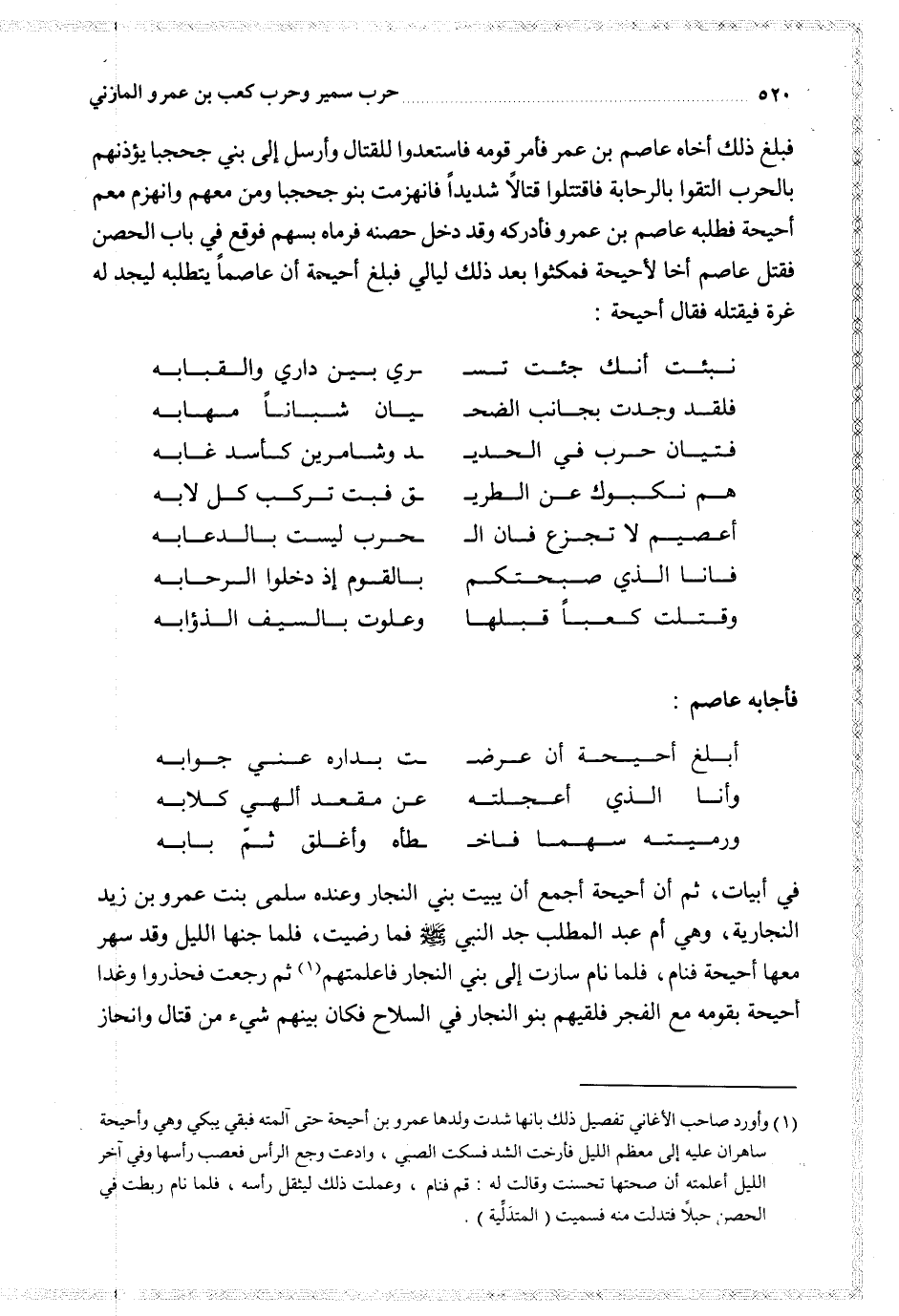 في أبيات ثم أن أحيحة أجمع أن يبيت بني النجار وعنده سلمى بنت عمرو بن زيد النجارية وهي أم عبد المطلب جد النبي فما رضيت فلما جنا الليل وقد سهر معها أحيحة فنام فلما نام سارت إلى بني النجار فاعلمتهم ثم رجعت فحذروا وغدا أحيحة بقومه مع الفجر فلقيهم بنو النجار في السلاح فكان بينهم شيء من قتال وانحاز