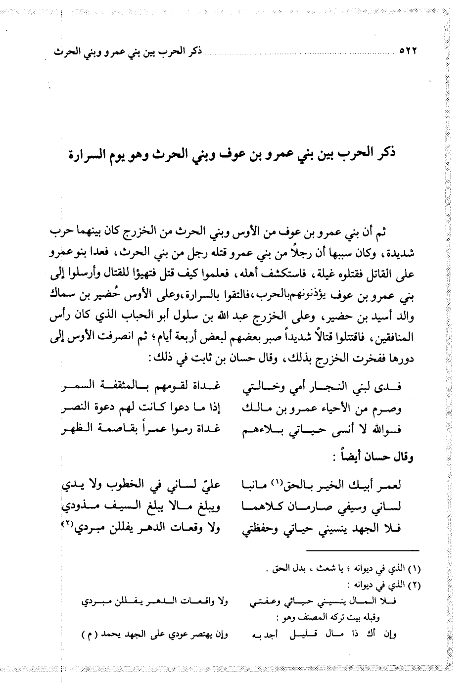 ثم أن بني عمرو بن عوف من الأوس وبني الحرث من الخزرج كان بينهما حرب شديدة وكان سببها أن رجلا من بني عمرو قتله رجل من بني الحرث فعدا بنو عمرو على القاتل فقتلوه غيله فاستكشف أهله فعلموا كيف قتل فتهيؤا للقتال وأرسلوا إلى بني عمرو بن عوف يؤذنونهم بالحرب فالتقوا بالسرارة وعلى الأوس حضير بن سماك والد أسيد بن حضير وعلى الخزرج عبد الله بن سلول أبو الحباب الذي كان رأس المنافقين فاقتتلوا قتالا شديدا صبر بعضهم لبعض أربعة أيام ثم انصرفت الأوس إلى دورها ففخرت الخزرج بذلك وقال حسان بن ثابت في ذلك