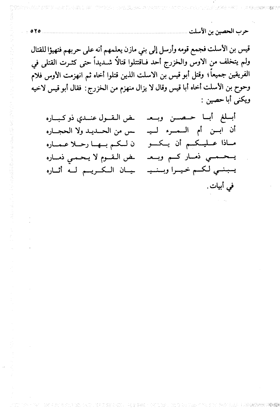قيس بن الأسلت فجمع قومه وأرسل إلى بني مازن يعلمهم أنه على حربهم فتهيؤا للقتال ولم يختلف من الأوس والخزرج أحد فاقتتلوا قتالا شديدا حتى كثرت القتلى في الفريقين جميعا وقتل أبو قيس بن الاسلت الذين قتلوا أخاه ثم انهزمت الأوس فلام وحوح بن الأسلت أخاه أبا قيس وقال لا يزال منهزم من الخزرج فقال أبو قيس لاخيه ويكنى أبا حصين