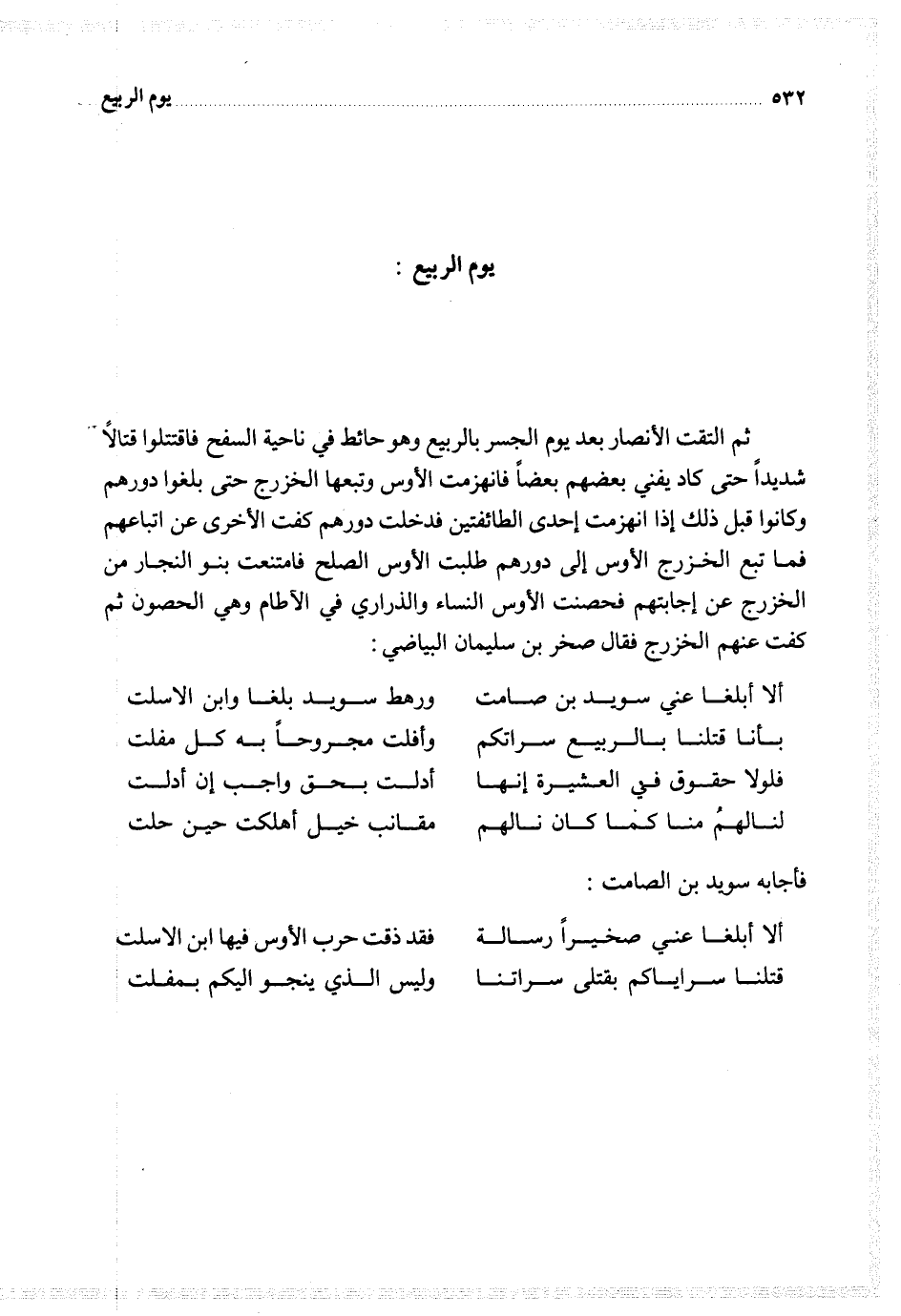 ثم التقت الأنصار بعد يوم الجسر بالربيع وهو حائط في ناحية السفح فاقتتلوا قتالا شديدا حتى كاد يفني بعضهم بعضا فانهزمت الأوس وتبعها الخزرج حتى بلغوا دورهم وكانوا قبل ذلك إذا انهزمت إحدى الطائفتين فدخلت دورهم كفت الأخرى عن اتباعهم فما تبعر الخزرج الأوس إلى دورهم طلبت الأوس الصلح فامتنعت بنو النجار من الخزرج عن إجابتهم فحصنت الأوس النساء والذراري في الآطام وهي الحصون ثم كفت عنهم الخزرج فقال صخر بن سليمان البياضي