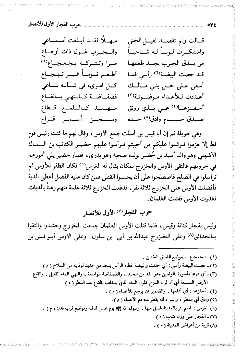 وهي طويلة ثم إن قيسا بن أسلت جمع الأوس وقال لهم ما كنت رئيس قوم قط إلا هزموا فرئسوا عليكم من أحببتم فرأسوا عليهم حضير الكتائب بن السماك الأشهلي وهو والد أسيد بن حضير لولده صحبة وهو بدري فصار حضير يلي أمورهم في حروبهم فالتقى الأوس والخزرج بمكان يقال له الغرس فكان الظفر للأوس ثم تراسلوا في الصلح فاصطلحوا على أن يحسبوا القتلى فمن كان عليه الفضل أعطى الدية فأضلت الأوس على الخزرج ثلاثة نفر فدفعت الخزرج ثلاثة غلمة منهم رهنا بالديات فغدرت الأوس فقتلت الغلمان