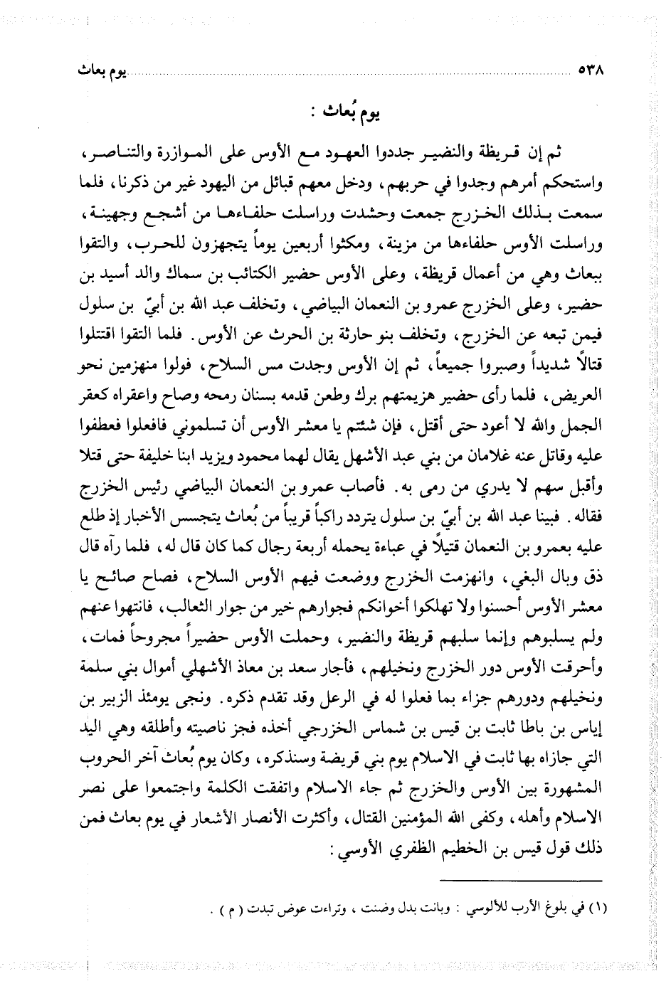 ثم إن قريظة والنضير جددوا العهود مع الأوس على الموازرة والتناصر واستحكم أمرهم وجدوا في حربهم ودخل معهم قبائل من اليهود غير ما ذكرنا فلما سمعت بذلك الخزرج جمعت وحشدت وراسلت حلفاءها من أشجع وجهينة وراسلت الأوس حلفاءها من مزينة ومكثوا أربعين يوما يتجهزون للحرب والتقوا ببعاث وهي من أعمال قريظة وعلى الأوس حضير الكتائب بن سماك والد أسيد بن حضير وعلى الخزرج عمرو بن النعمان البياضي وتخلف عبد الله بن أبي سلوك في من تبعه عن الخزرج وتخلف بنو حارثه بن الحرث عن الأوس فما التقوا اقتتلوا قتالا شديدا وصبروا جميعا ثم إن الأوس وجدت مس السلاح فولوا منهزمين نحو العريض فلما رأى حضير هزيمتهم برك وطعن قدمه بسنان رمحه وصاح واعقراه كعقر الجمل والله لا أعود حتى أقتل فإن شئتم يا معشر الأوس أن تسلموني فافعلوا فعطفوا عليه وقاتل عنه غلامان من بني عبد الأشهل يقال لهما محمود ويزيد ابنا خليفة حتى قتلا وأقبل سهم لا يدري من رمى به فأصاب عمرو بن النعمان البياضي رئيس الخزرج فقال فبين عبد الله بن أبي سلول يتردد راكبا قريبا من بعاث يتجسس الأخبار إذ طلع عليه بعمرو بن النعمان قتيلا في عباءة يحمله أربعة رجال كما كان قال له فلما رآه قال ذق وبال البغي وانهزمت الخزرج ووضعت فيهم الأوس السلاح فصاح صائح يا معشر الأوس أحسنوا ولا تهلكوا أخوانكم فجوارهم خير من جوار الثعالب فانتهوا عنهم ولم يسلبوهم وإنما سلبهم قريظة والنضير وحملت الأوس حضيرا مجروحا فمات وأحرقت الأوس دور الخزرج ونخيلهم فأجار سعد بن معاذ الأشهلي أمول بني سلمة ونخليهم ودورهم جزاءا بما فعلوا له في الرعل وقد تقدم ذكره ونجى يومئذ الزبير بن إياس بن باطا ثابت بن قيس بن شماس الخزرجي أخذه فجز ناصيته وأطلقه وهي اليد التي جازاه بها ثابت في الإسلام يوم بني قريظة وسنذكره وكان يوم بعاث آخر الحروب المشهورة بين الأوس والخزرج ثم جاء الإسلام واتفقت الكلمة واجتمعوا على نصر الإسلام وأهله وكفى الله المؤمنين القتال وأكثرت الأنصار الأشعار في يوم بعاث فمن ذلك قول قيس بن الخطيم الظفري الأوسي
