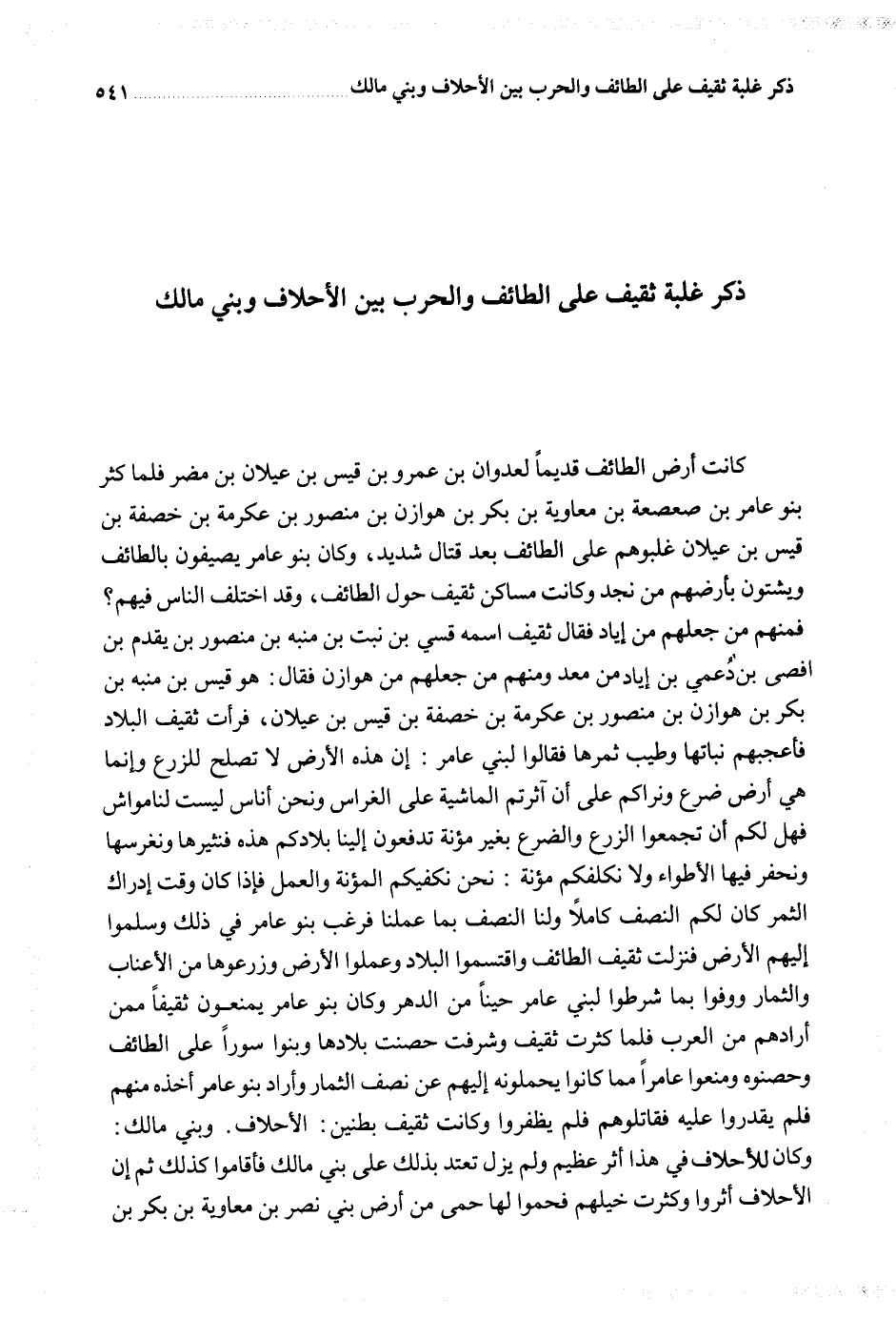 كانت أرض الطائف قديما لعدوان بن عمرو بن قيس بن عيلان بن مضر فلما كثر بنو عامر بن صعصعة بن معاوية بن بكر بن هوازن بن منصور بن عكرمة بن خصفة بن قيس بن عيلان غلبوهم على الطائف بعد قتال شديد وكان بنو عامر يصيفون بالطائف ويشتون بأرضهم من نجد وكانت مساكن ثقيف حول الطائف وقد اختلف الناس فيهم فمنهم من جعلهم من إياد فقال ثقيف اسمه قسي بن نبت بن منبه بن منصور بن يقدم بن افصى بن دعمي بن إياد من معد ومنهم من جعلهم من هوازن فقال هو قيس بن منبه بن بكر بن هوازن بن منصور بن عكرمة بن خصفة بن قيس بن عيلان فرأت ثقيف البلاد فأعجبهم نباتها وطيب ثمرها فقالوا لبني عامر إن هذه الأرض لا تصلح للزرع وإنما هي أرض ضرع ونراكم على أن آثرتم الماشية على الغراس نحن أناس ليست لنا مواش فهل لكم أن تجمعوا الزرع والضرع بغير مؤنة تدفعون إلينا بلادكم هذه فنثيرها ونغرسها ونحفر فيها الأطوار ولا نكلفكم مؤنة نحن نكفيكم المؤنة والعمل فإذا كنت وقت إدراك الثمر كان لكم النصف كاملا ولنا النصف بما عملنا فرغب بنو عامر في ذلك وسلموا إليهم الأرض فنزلت ثقيف الطائف واقتسموا البلاد وعملوا الأرض وزرعوها من الأعناب والثمار ووفوا بم شرطوا لبني عامر حينا من الدهر وكان بنو عامر يمنعون ثقيفا ممن أرادهم من العرب فلما كثرت ثقيف وشرفت حصنت بلادها وبنوا سورا على الطائف وحصنوه ومنعوا عامرا مما كانوا يحملونه إليهم عن نصف الثمار وأراد بنو عامر أخذه منهم فلم يقدروا عليه فقاتلوهم فلم يظفروا وكانت ثقيف بطنين الأحلاف وبني مالك وكان للأحلاف في هذا أثر عظيم ولم يزل تعتد بذلك على بني مالك فأقاموا كذلك ثم إن الأحلاف أثروا وكثرت خيلهم فحموا لها حمى من أرض بني نصر بن معاوية بن بكر بن