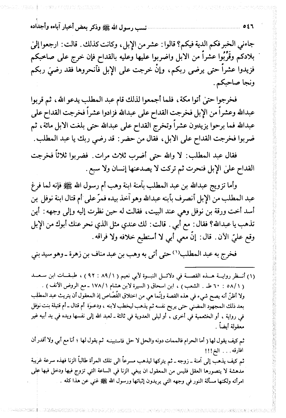 وأما تزويج عبدالله بن عبد المطلب بآمنة ابنة وهب أم رسول الله فإنه لما فرغ عبد المطلب من الإبل انصرف بابنة عبدالله وهو اخذ بيده فمر على أم قتال ابنة نوفل بن أسد أخت ورقة بن نوفل وهي عند البيت فقالت له حين نظرت إليه وإلى وجهه أين تذهب يا عبدالله فقال مع أبي قالت لك عندي مثل الذي نحر عنك أبوك من الإبل وقع علي الآن قال إن معي أبي لا أستطيع خلافه ولا فراقه