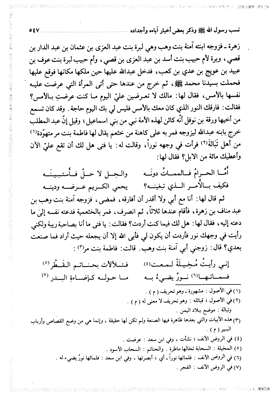 زهرة فزوجه ابنته آمنة بنت وهب وهي لبرة بنت عبد العزى بن عثمان بن عبد الدار بن قصي وبرة لأم حبيب بنت أسد بن عبد العزى بن قصي وأم حبيب لبرة بنت عوف بن عبيد بن عويج بن عدي بن كعب فدخل عبد الله عليها حين ملكها مكانها فوقع عليها فحملت بسيدنا محمد ثم خرج من عندها حتى أتى المرأة التي عرضت عليه نفسها بالأمس فقال لها مالك لا تعرضين علي اليوم ما كنت عرضت بالأمس فقالت فارقك النور الذي كان معك بالأمس فليس لي بك اليوم حاجة وقد كان تسمع من أخيها ورقة بن نوفل أنه كائن لهذه الأمة نبي من بني اسماعيل وقيل إن عبد المطلب خرج بابنه عبد الله ليزوجه فمر به على كاهنة من خثعم يقال لها فاطمة بنت مر متهودة من أهل تبالة فرأت في وجهه نورا وقالت له يا فتى هل لك أن تقع علي الآن وأعطيك مائة من الابل فقال لها