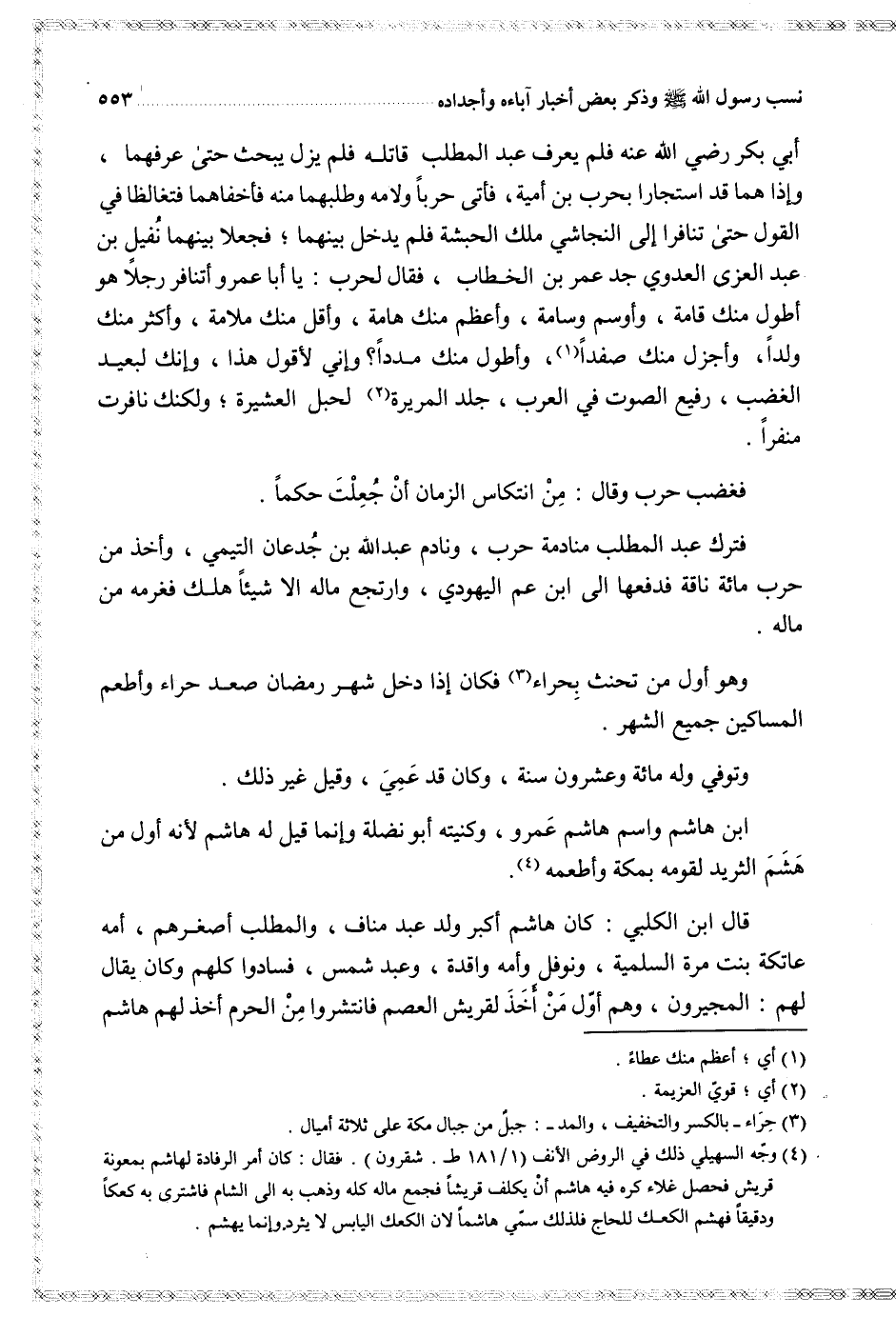أبي بكر رضي الله عنه فلم يعرف عبد المطلب قاتله فلم يزل يبحث حتى عرفهما وإذا هما قد استجارا بحرب بن أمية فأتى حربا ولامه وطلبهما منه فأخفاهما فتغالظا في القول حتى تنافرا إلى النجاشي ملك الحبشة فلم يدخل بينهما فجعلا بينهما نفيل بن عبد العزى العدوي جد عمر بن الخطاب فقال لحرب يا أبا عمرو أتنافر رجلا هو أطول منك قامة وأوسم وسامة وأعظم منك هامة وأقل منك ملامة وأكثر منك ولدا وأجزل منك صفدا وأطول منك مددا وإني لأقول هذا وإنك لبعيد الغضب رفيع الصوت في العرب جلد المريرة لحبل العشيرة ولكنك نافرت منفرا