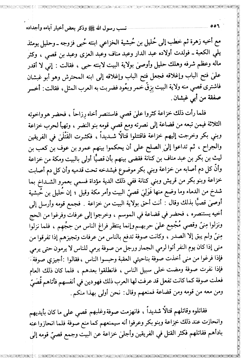 فقاتلوه وقاتلهم قتالا شديدا فانهزمت صوفة وغلبهم قصي على ما كان بأيديهم وانحازت عند ذلك ذلك خزاعة وبنو بكر وعرفوا أنه سيمنعهم كما منع صوفة فلما انحازوا عنه بادأهم فقاتلهم فكثر القتل في الفريقين وأجلى خزاعة عن البيت وجمع قصي قومه إلى
