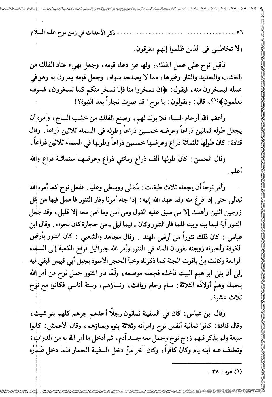 وأعقم الله أرحام النساء فلا يولد لهم وصنع الفلك من خشب الساج وأمره أن يجعل طوله ثمانين ذراعا وعرضه خمسين ذراعا وطولها في السماء ثلاثين ذراعا