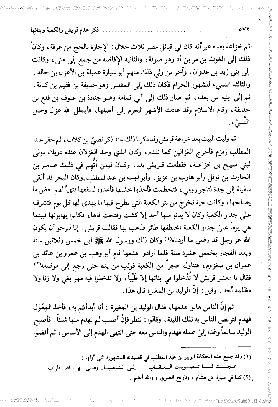 ثم إن الناس هابوا هدمها فقال الوليد بن المغيرة أنا أبدأكم به فأخذ المعول فهدم فتربص الناس به تلك الليلة وقالوا ننظر فإن أصاب لم نهدم منها شيئا فاصبح الوليد سالما وغدا إلى عمله فهدم والناس معه حتى انتهى الهدم إلى الأساس ثم أفضوا