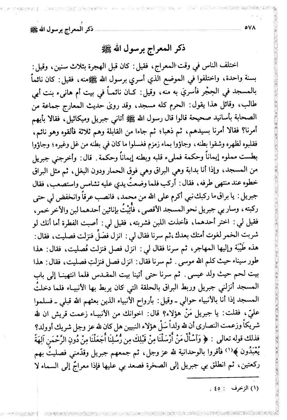 اختلف الناس في وقت المعراج فقيل كان قبل الهجرة بثلاث سنين وقيل بسنة واحدة واختلفوا في الموضع الذي أسري برسول الله منه فقيل كان نائما بالمسجد في الحجر فأسري به منه وقيل كان نائما في بيت أم هانئ بنت أبي طالب وقال هذه يقول الحرم كله مسجد وقد روى حديث المعراج جماعة من الصحابة بأسانيد صحيحة قالوا قال رسول الله أتاني جبريل وميكائيل فقالا بأيهم أمرنا فقالا أمرنا بسيدهم ثم ذهبا ثم جاءا من القابلة وهم ثلاثة فألقوه وهو نائم فقلبوه لظهره وشقوا بطنه وجاؤوا بماء زمزم فغسلوا ما كان في بطنه من غل وغيره وجاؤوا بطست مملوء إيمانا وحكمة فملئ قلبه وبطنه إيمانا وحكمة قال وأخرجني جبريل من المسجد وإذا أنا بدابة وهي البراق وهي فوق الحمال دون البغل ثم مثل البراق خطوة عند منتهى طرفه فقال اركب فلما وضعت يدي عليه تشامس واستعصب فقال جبريل يا براق ما ركبك نبي أكرم على الله من محمد فانصب عرقا وانخفض لي حتى ركبته وسار بي نحو المسجد الأقصى فأتيت بإنائين أحدهما لبنا والآخر خمر فقيل لي اختر أحدهما فأخذت اللبن فشربته فقيل لي أصبت الفطرة أما أنكم لو شربت الخمر لغوت أمتك بعدك ثم سرنا فقال لي انزل فصل فصليت فقال هذا طور سيناء حيث كلم الله موسى ثم سرنا حتى أتينا بيت المقدس فلما انتهينا إلى باب المسجد أنزلني جبريل وربط البراق بالحلقة التي كان يربط بها الأنبياء فلما دخلت المسجد إذا أنا بالأنبياء حوالي وقيل بأرواح الأنبياء الذين بعثهم الله قبلي فسلموا علي فقلت يا جبريل من هؤلاء قال اخوانك من الأنبياء زعمت قريش أن لله شريكا وزعمت النصارى أن لله ولدا سل هؤلاء هل كان لله عز وجل شريك أو ولد فذلك قوله تعالى {واسأل من أرسلنا من قبلك من رسلنا أجعلنا من دون الرحمن آلهة يعبدون} فأقروا بالوحدانية لله عز وجل ثم جمعهم جبريل وقدمني فصليت بهم ركعتين ثم انطلق بي جبريل إلى الصخرة فصعد بي عليها فإذا معراج إلى السماء لا
