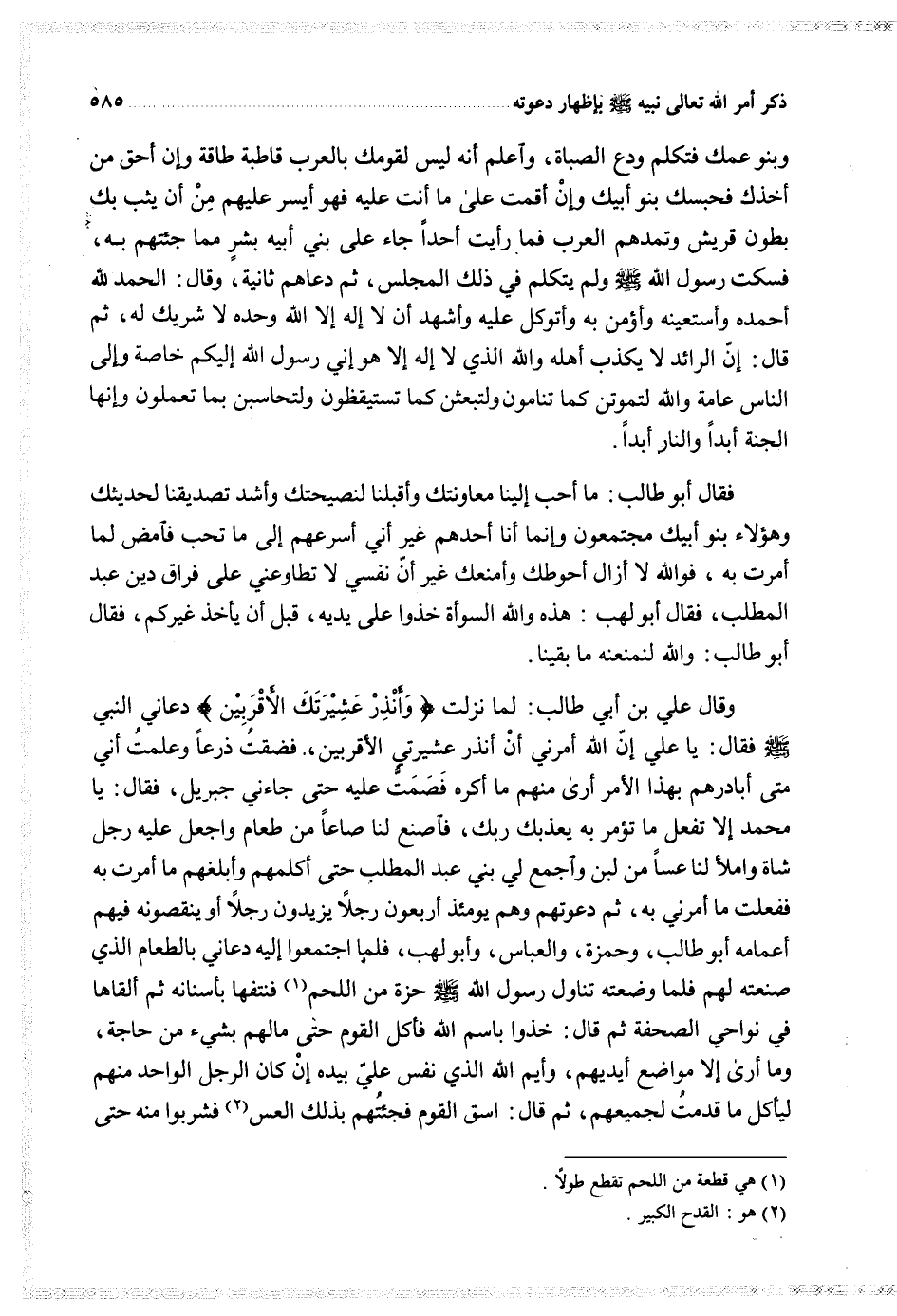 وقال علي بن أبي طالب لما نزلت {وأنذر عشيرتك الأقربين} دعاني النبي فقال يا علي إن الله أمرني أن أنذر عشيرتي الأقربين فضقت ذرعا وعلمت أني متى أبادرهم بهذا الأمر أرى منهم ما أكره فصمت عليه حتى جاءني جبريل فقال يا محمد إلا تفعل ما تؤمر به يعذبك ربك فاصنع لنا صاعا من طعام واجعل عليه رجل شاة واملأ لنا عسا من لبن واجمع لي بني عبد المطلب حتى أكلمهم وأبلغهم ما أمرت به ففعلت ما أمرني به ثم دعوتهم وهم يومئذ أربعون رجلا يزيدون أو ينقصونه فيهم أعمامه أبو طالب وحمزة والعباس وأبو لهب فلما اجتمعوا إليه دعاني بالطعام الذي صنعته لهم فلما وضعته تناول رسول الله حزة من اللحم فنتفها بأسنانه ثم ألقاها في نواحي الصحفة ثم قال خذوا باسم الله فأكل القوم حتى مالهم بشيء من حاجة وما أرى إلا مواضع أيديهم وأيم الله الذي نفس علي بيده إن كان الرجل الواحد منهم ليأكل ما قدمت لجميعهم ثم قال اسق القوم فجئتهم بذلك العس فشربوا منه حتى