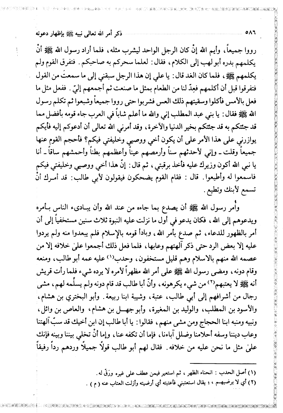 رووا جميعا وأيم الله إن كان الرجل الواحد ليشرب مثله فلما أراد رسول الله أن يكلمهم بدره أبو لهب إلى الكلام فقال لعلما سحركم به صاحبكم فتفرق القوم ولم يكلمهم فلما كان الغد قال يا علي إن هذا الرجل سبقني إلى ما سمعت من القول فتفترقوا قبل أن أكلمهم فعد لنا من الطعام بمثل ما صنعت ثم أجمعهم إلي ففعل مثل فعل بالأمس فأكلوا وسقيتهم ذلك العس فشربوا حتى رووا جميعا وشبعوا ثم تكلم رسول الله فقال يا بني عبد المطلب إني والله ما أعلم شاب في العرب جاء قومه بأفضل مما قد جئتكم به قد جئتكم بخير الدنيا والآخرة وقد أمرني الله تعالى أن أدعوكم إليه فأيكم يوازرني على هذا الأمر على أن يكون أخي ووصيي وخليفتي فيكم فأحجم القوم عنها جيمعا وقلت وإني لأحدثهم سنا وأرمصهم عينا وأعظمهم بطنا وأحمشهم ساقا أنا يا نبي الله أكون وزيرك عليه فأخذ برقبتي ثم قال إن هذا أخي ووصيتي وخليفتي فيكم فاسمعوا له وأطيعوا قال فقام القوم يضحكون فيقولون لأبي طالب قد أمرك أن تسمع لأبنك وتطيع