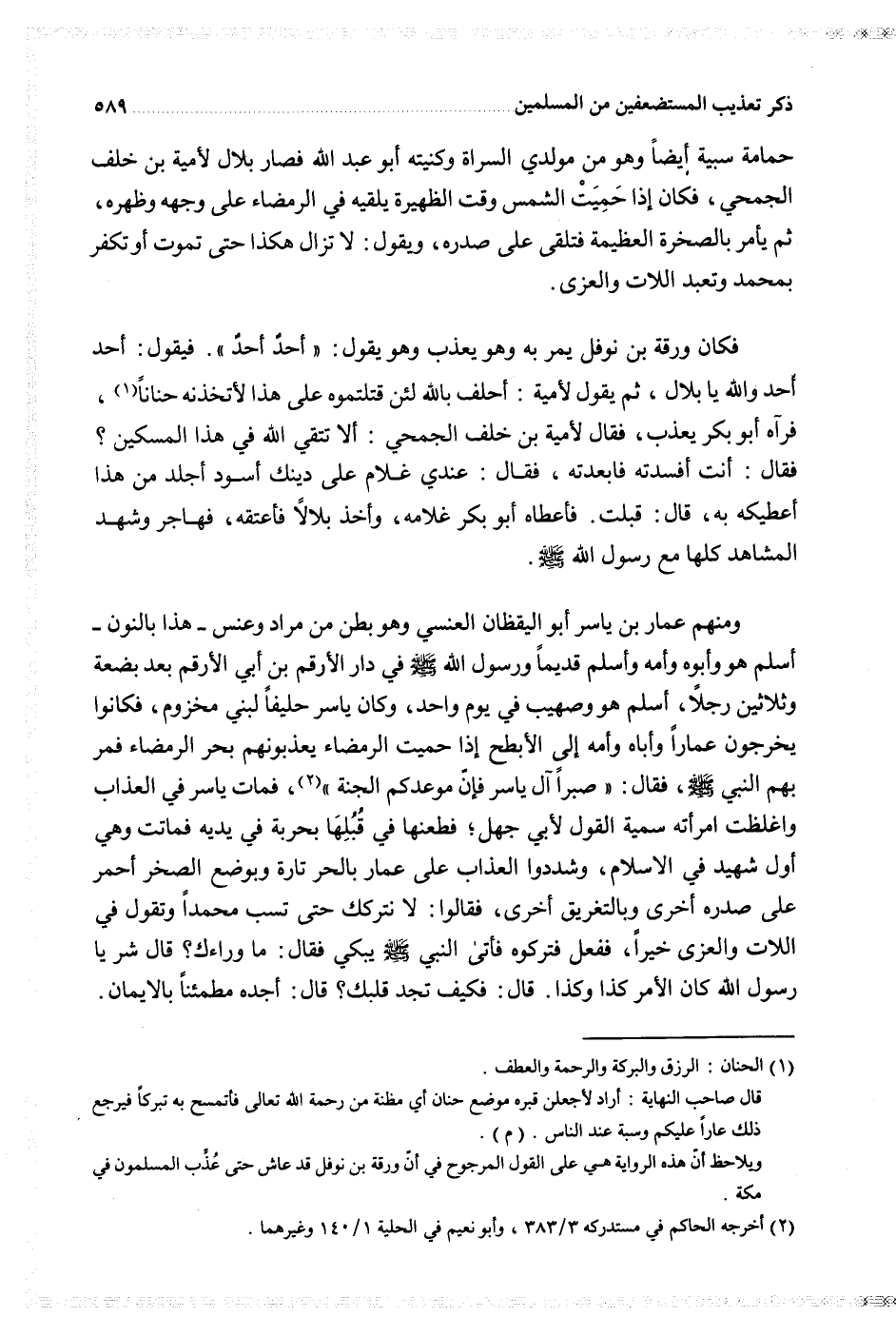 فكان ورقة بن نوفل يمر به وهو يعذب وهو يقول أحد أحد فيقول أحد والله يا بلال ثم يقول لأميه أحلف بالله لئن قتلتموه على هذا لأتخذنه حنانا فرآه أبو بكر يعذب فقال لأميه بن خلف الجمحي ألا تتقي الله في هذا المسكين فقال أنت أفسدته فابعدته فقال عندي غلام على دينك أسود أجلد من هذا أعطيكه به قال قبلت فأعطاه أبو بكر غلامه وأخذ بلالا فأعتقه فهاجر وشهد المشاهد كلها مع رسول الله