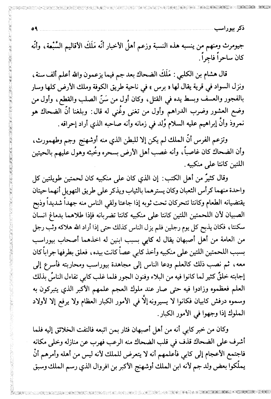 قال هشام بن الكلبي ملك الضحاك بعد جم فيما يزعمون والله أعلم ألف سنة ونزل السواد في قرية لها برس في ناحية طريق الكوفة وملك الأرض كلها وسار بالفجور والعسف وبسط يده في القتل وكان أول من سن الصلب والقطع وأول من وضع العشور وضرب الرداهم وأول من تغنى وغني له قال وبلغنا أن الضحاك هو نمروذ وأن إبراهيم عليه السلام ولد في زمانه وأنه صاحبه الذي أراد إحراقه