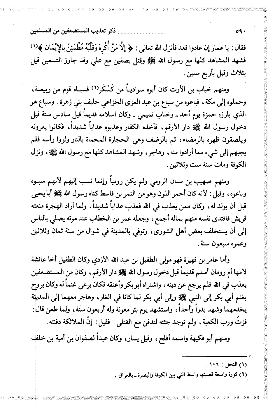 ومنهم خباب بن الأرت كان أبوه سواديا من كسكر فسباه قوم من ربيعة وحملوه إلى مكة فباعوه من سباع بن عبد العزى الخزاعي حليف بني زهرة وسباع هو الذي بارزه حمزة يوم أحد وخباب تميمي وكان اسلامه قديما قيل سادس ستة قبل دخول رسول الله دار الأرقم فأخذه الكفار وعذبوه عذابا شديدا فكانوا يعرونه ويلصقون ظهره بالرمضاء ثم بالرضف وهي الحجارة المحماة بالنار ولووا رأسه فلم يجبهم إلى شيء مما أرادوا منه وهاجر وشهد المشاهد كلها مع رسول الله ونزل الكوفة ومات سنة ست وثلاثين