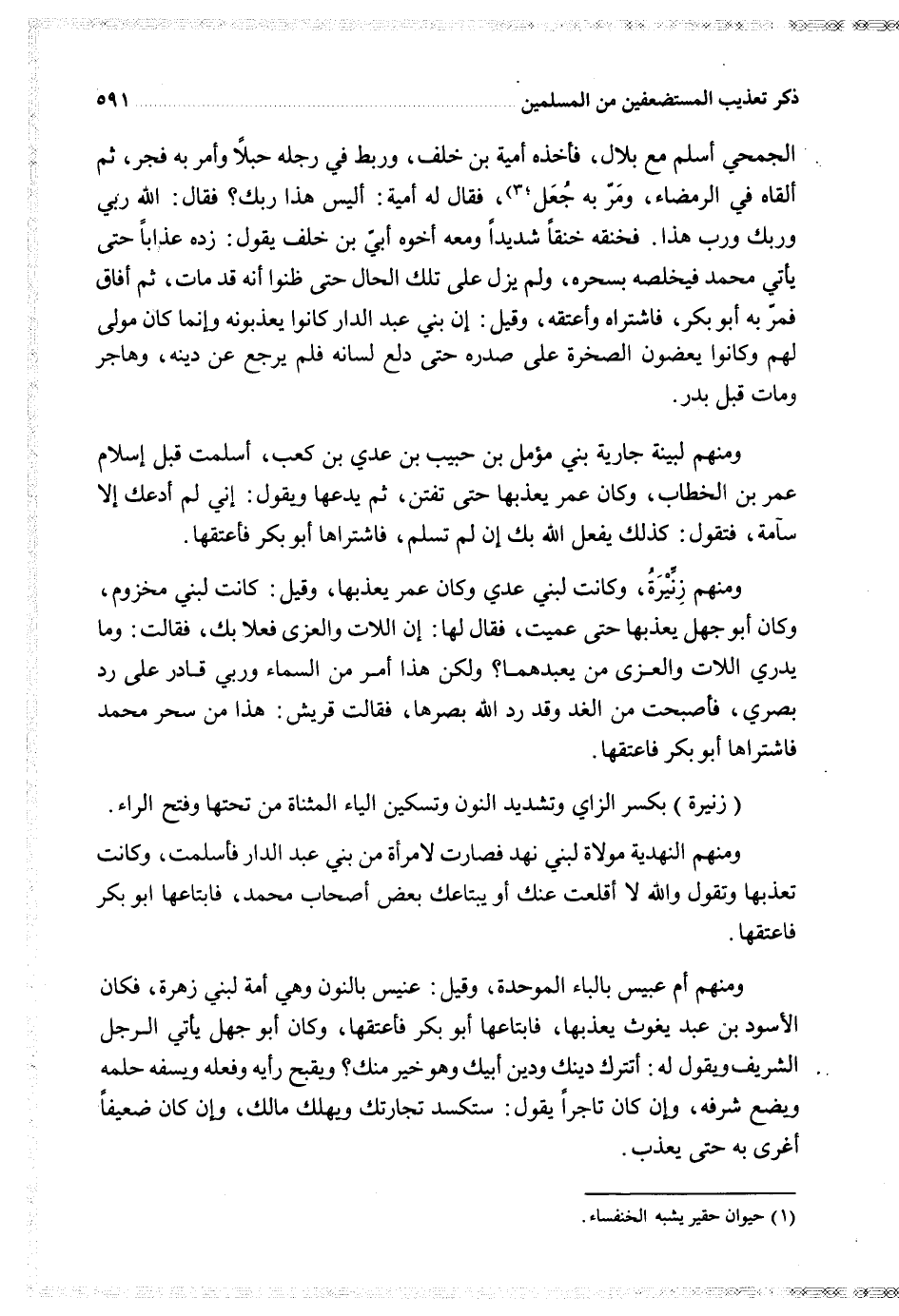 ومنهم زنيرة وكانت لبني عدي وكان عمر يعذبها وقيل كانت لبني مخزوم وكان أبو جهل يعذبها حتى عميت فقال لها إن اللات والعزى فعلا بك فقالت وما يدري اللات والعزى من يعبدهما ولكن هذا أمر من السماء وربي قادر على رد بصري فأصبحت من الغد وقد رد الله بصرها فقالت قريش هذا من سحر محمد فاشتراها أبو بكر فاعتقها