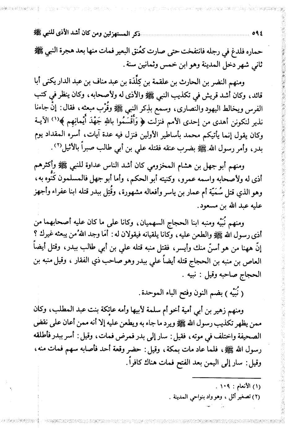 ومنهم نبيه ومنبه ابنا الحجاج السهميان وكانا على ما كان عليه أصحابهما من أذى رسول الله والطعن عليه وكانا يلقيانه فيقولان له أما وجد الله من يبعثه غيرك إن ههنا من هو أسن منك وأيسر فقتل منبه قتله علي بن أبي طالب ببدر وقتل أيضا العاص بن منبه بن الحجاج قتله أيضا علي ببدر وهو صاحب ذي الفقار وقيل منبه بن الحجاج صاحبه وقيل نبيه